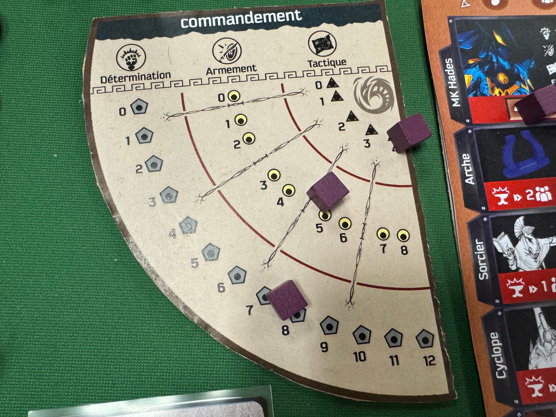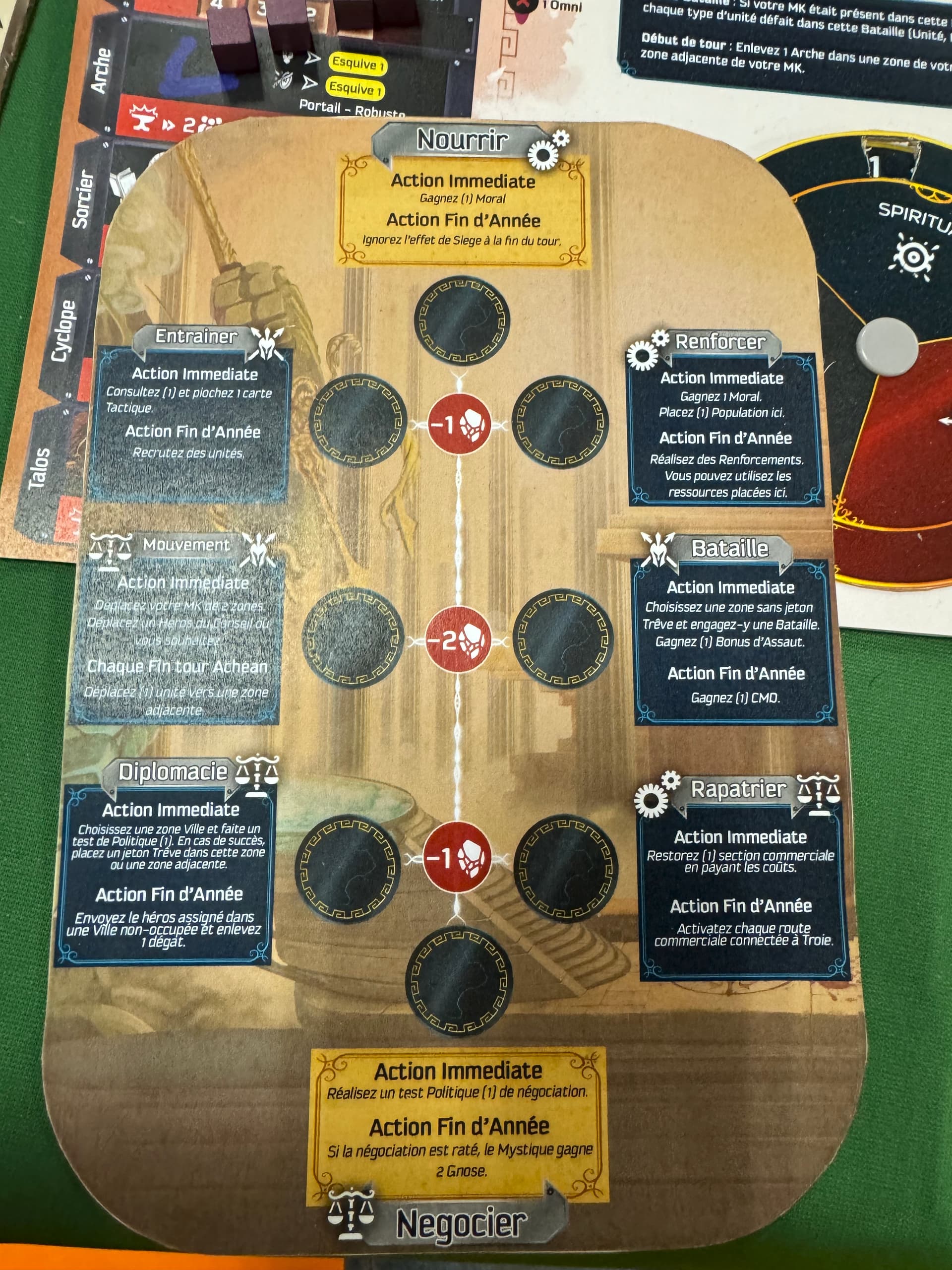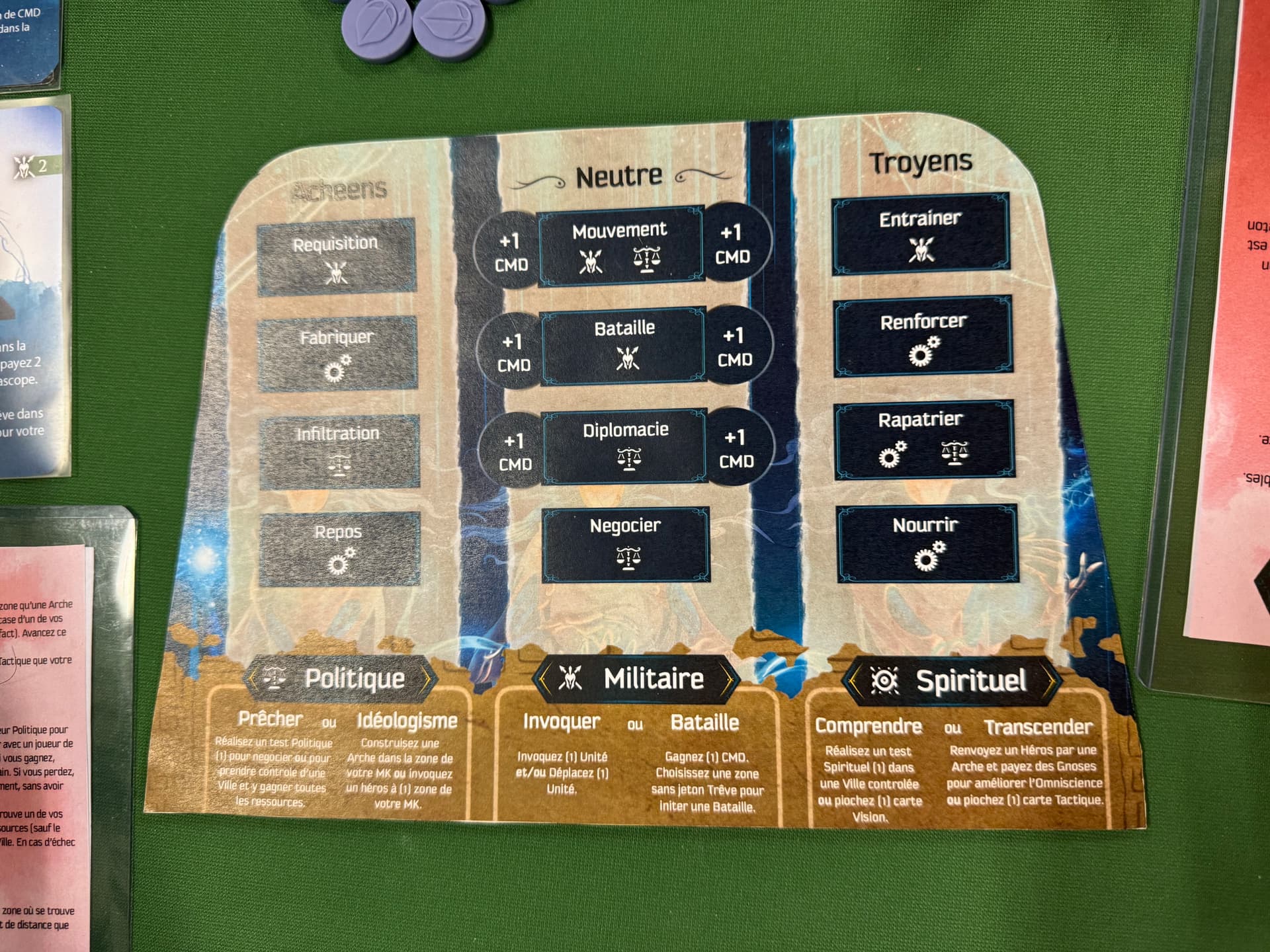 A la place ils, doivent prédire secrètement, via une sorte de planche ouija recensant toutes les Actions du jeu, les 4 Actions les plus susceptibles d’être jouées pendant le tour par l’Achéen ou le Troyen. Chaque fois qu’un adversaire annonce son action du tour, le joueur Mystique révèle sur sa planche s’il avait prédit cette action ou pas. S’il a réussi, il joue immédiatement une de ses actions au choix avant de rendre la main au joueur, s’il a raté l’adversaire réalise normalement son action. Ce mécanisme est génial, mais si vous ne vous intéressez pas au conflit en cours entre les deux autres, vous pouvez très bien vous retrouver à NE PAS JOUER DU TOUT pendant tout le tour. Ce twist oblige le Mystique a être autre chose qu’un spectateur passif et bien souvent au contraire, on tente, par la parole ou ses propres actions, d’orienter celles de nos petits camarades : c’est jouissif !