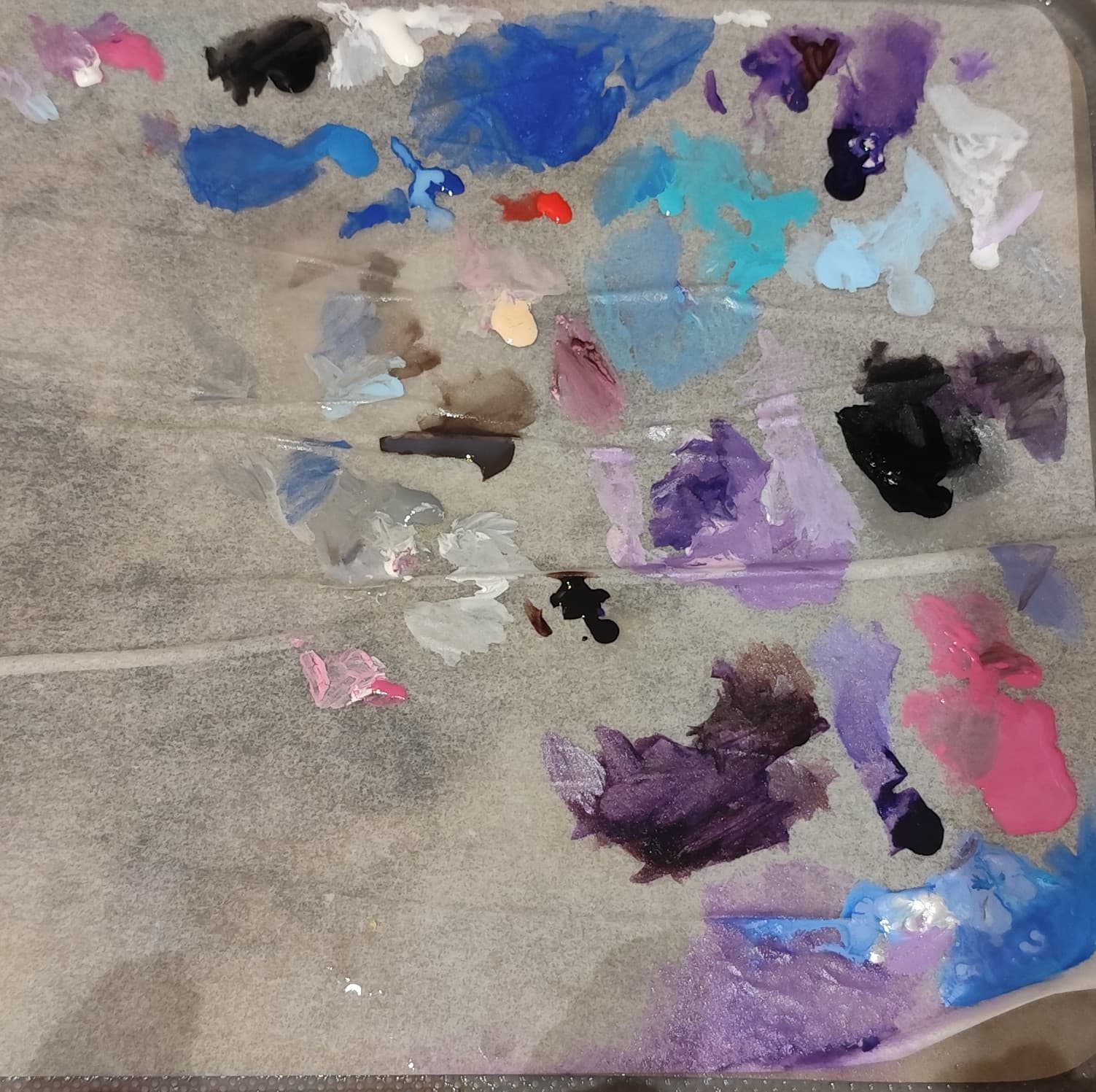 C’est le bordel, mais il y a au moins 3 ou 4 zones avec du pourpre et de la peinture iridescente et pas mal de doublons. Pour les couleurs, du pourpre (peinture et encre), du terre de sienne brûlée (encre), de la peinture iridescente, un rose clair, un rose très clair, du bleu outremer, du bleu turquoise, un bleu très clair dans la gamme Rackham (ça ne me rajeunit pas) de l’encre rose fluo, noir, gris foncé, gris clair, gris très clair, du dark tone army painter, du rouge pur.