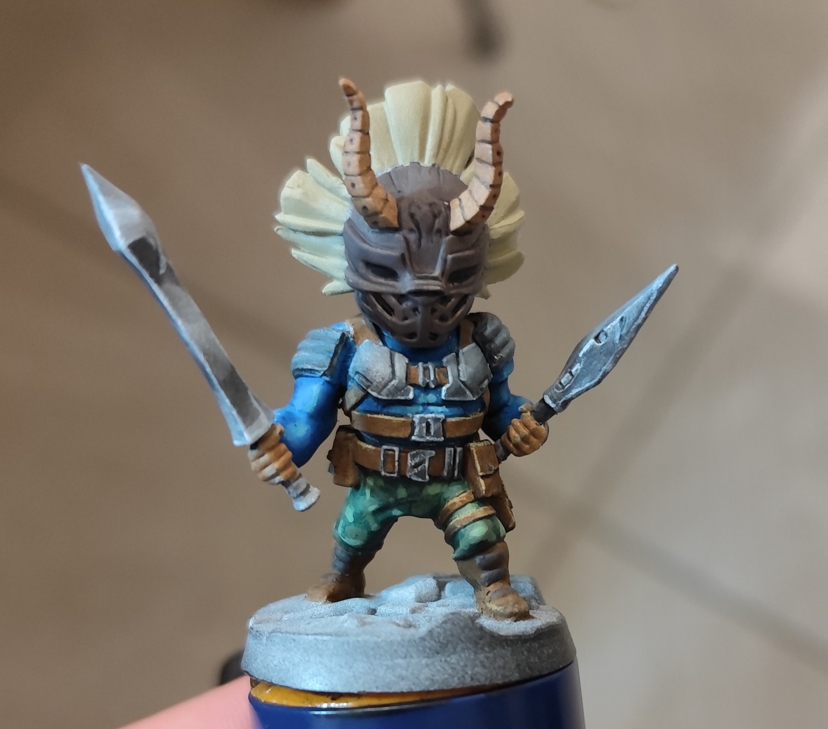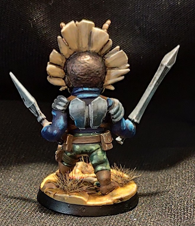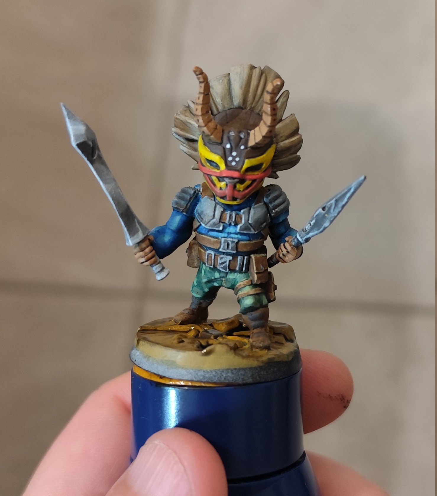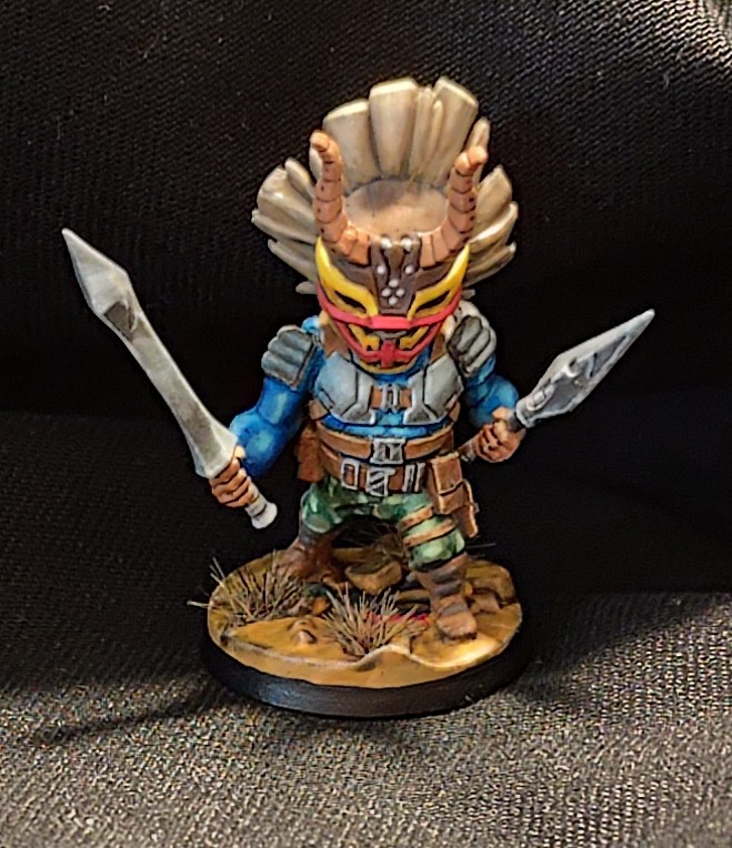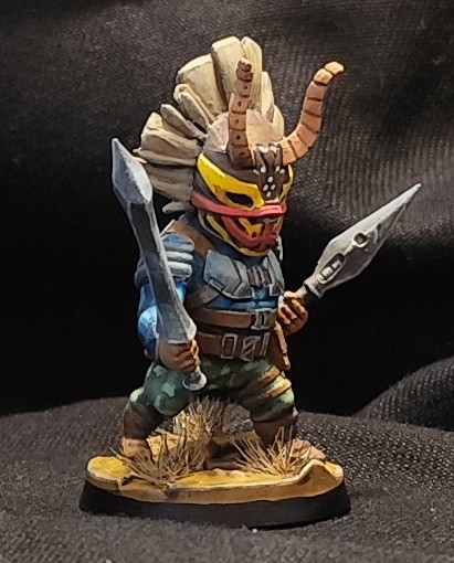 - le masque a été fait aux feutres RC color de chez AK : chipping color pour le marron foncé, rouge et jaune, les cornes sont aussi faites avec la même gamme, j’ai juste repassé du noir pour souligner les volumes et les petits points blancs pour attirer l’œil, quelques glacis derrière pour éviter que le rouge et le jaune ne soient trop trop pétant partout, mais pas trop non plus pour qu’il y ait bien le ressenti « masque tribal », pour la crête, c’est un base de « wood base » AK, un coup de strong tone pour foncer, et du « titan buff » sennelier pour éclaircir