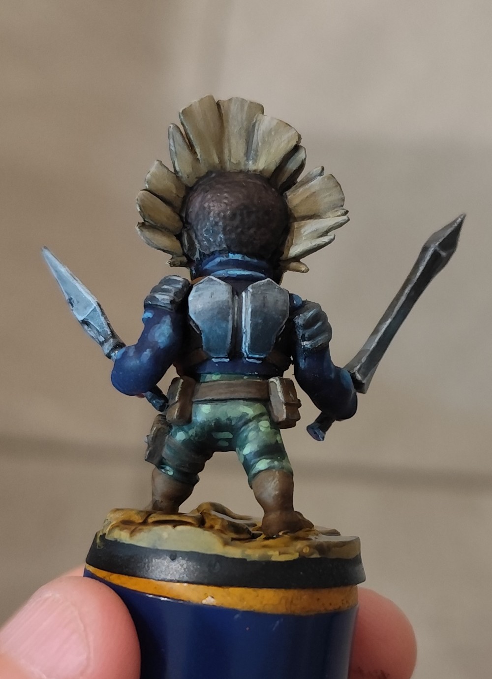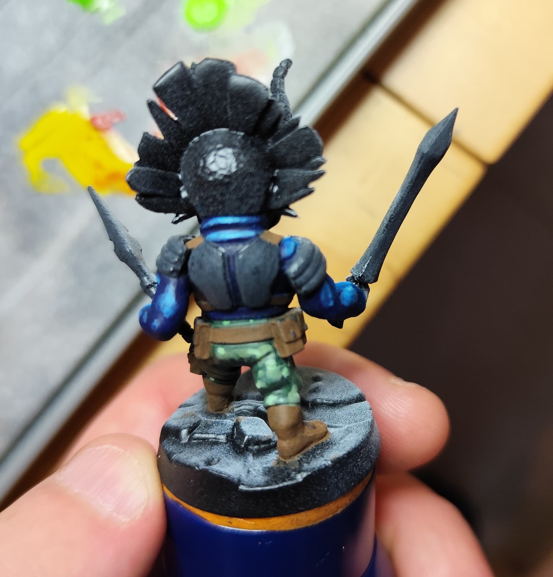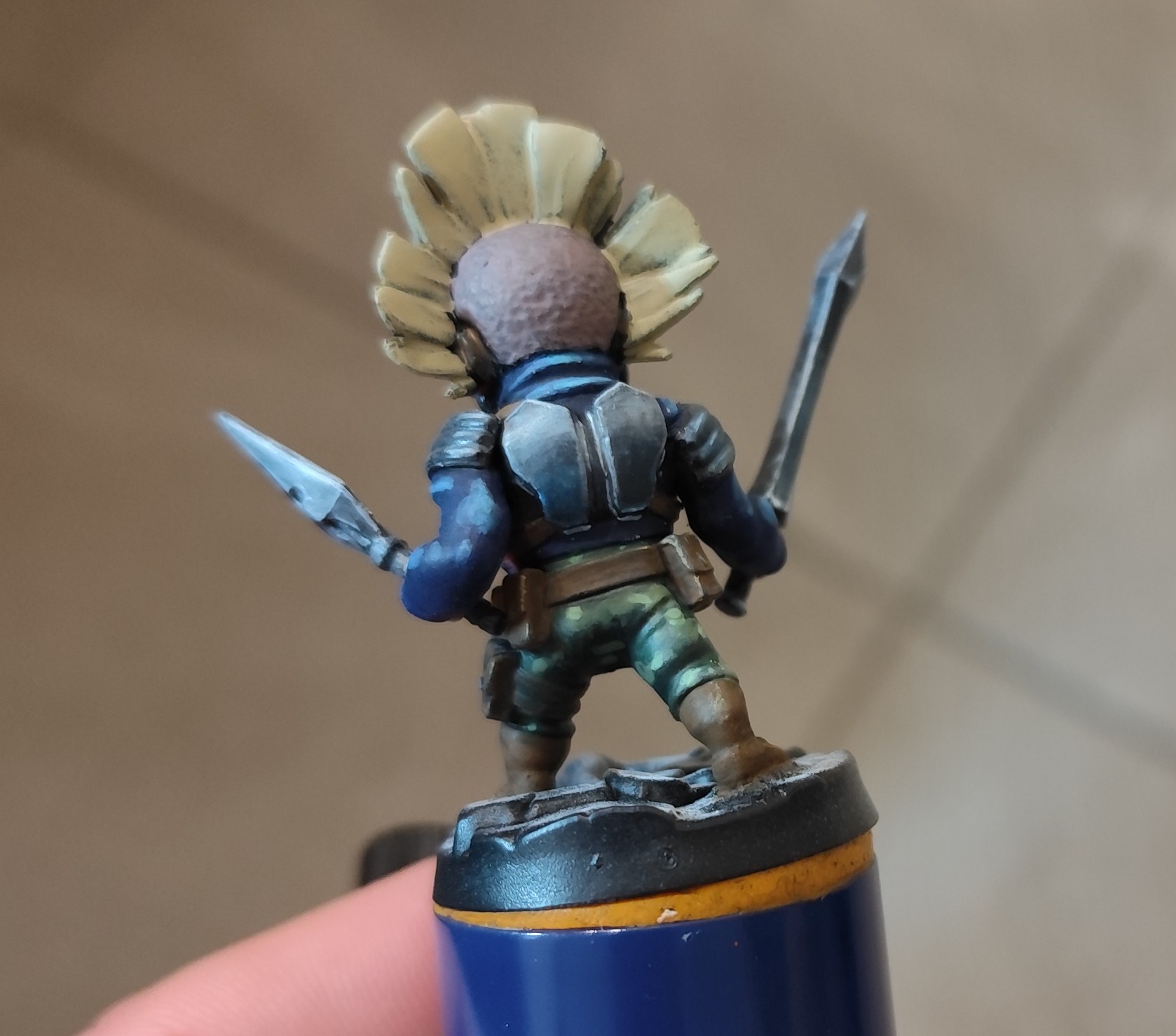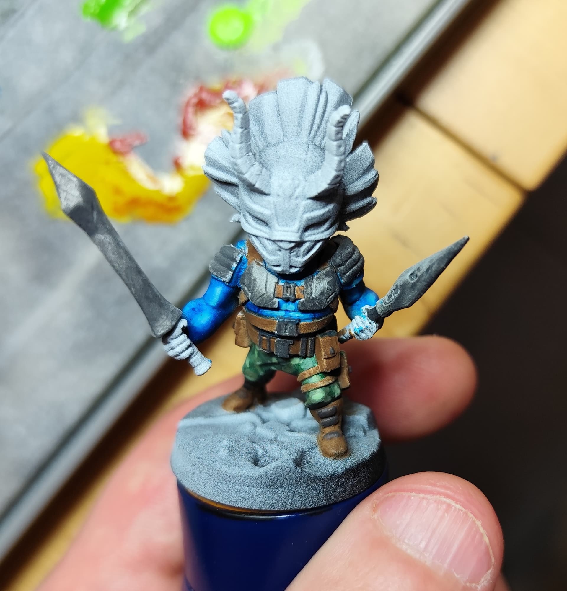 - le masque a été fait aux feutres RC color de chez AK : chipping color pour le marron foncé, rouge et jaune, les cornes sont aussi faites avec la même gamme, j’ai juste repassé du noir pour souligner les volumes et les petits points blancs pour attirer l’œil, quelques glacis derrière pour éviter que le rouge et le jaune ne soient trop trop pétant partout, mais pas trop non plus pour qu’il y ait bien le ressenti « masque tribal », pour la crête, c’est un base de « wood base » AK, un coup de strong tone pour foncer, et du « titan buff » sennelier pour éclaircir