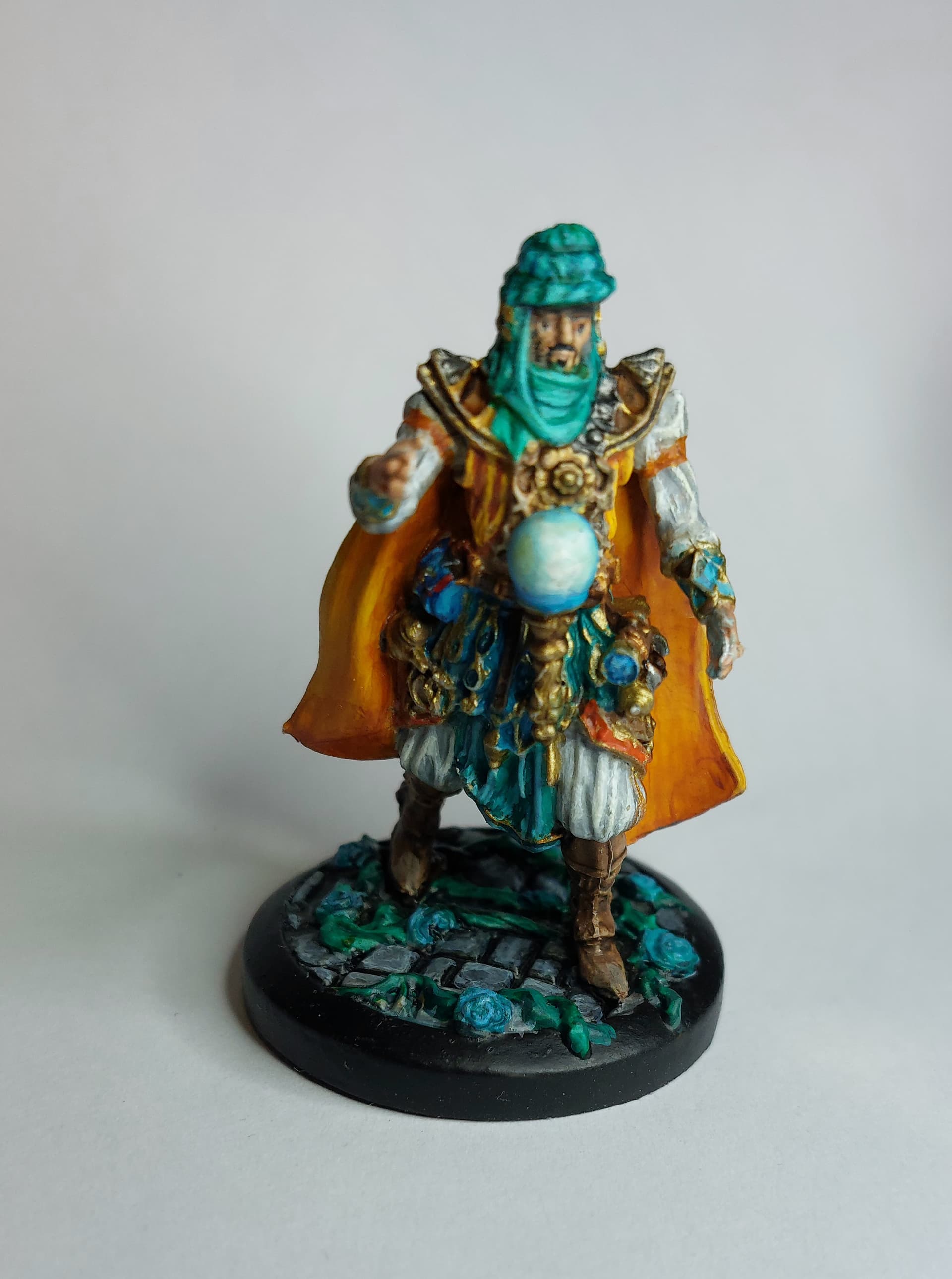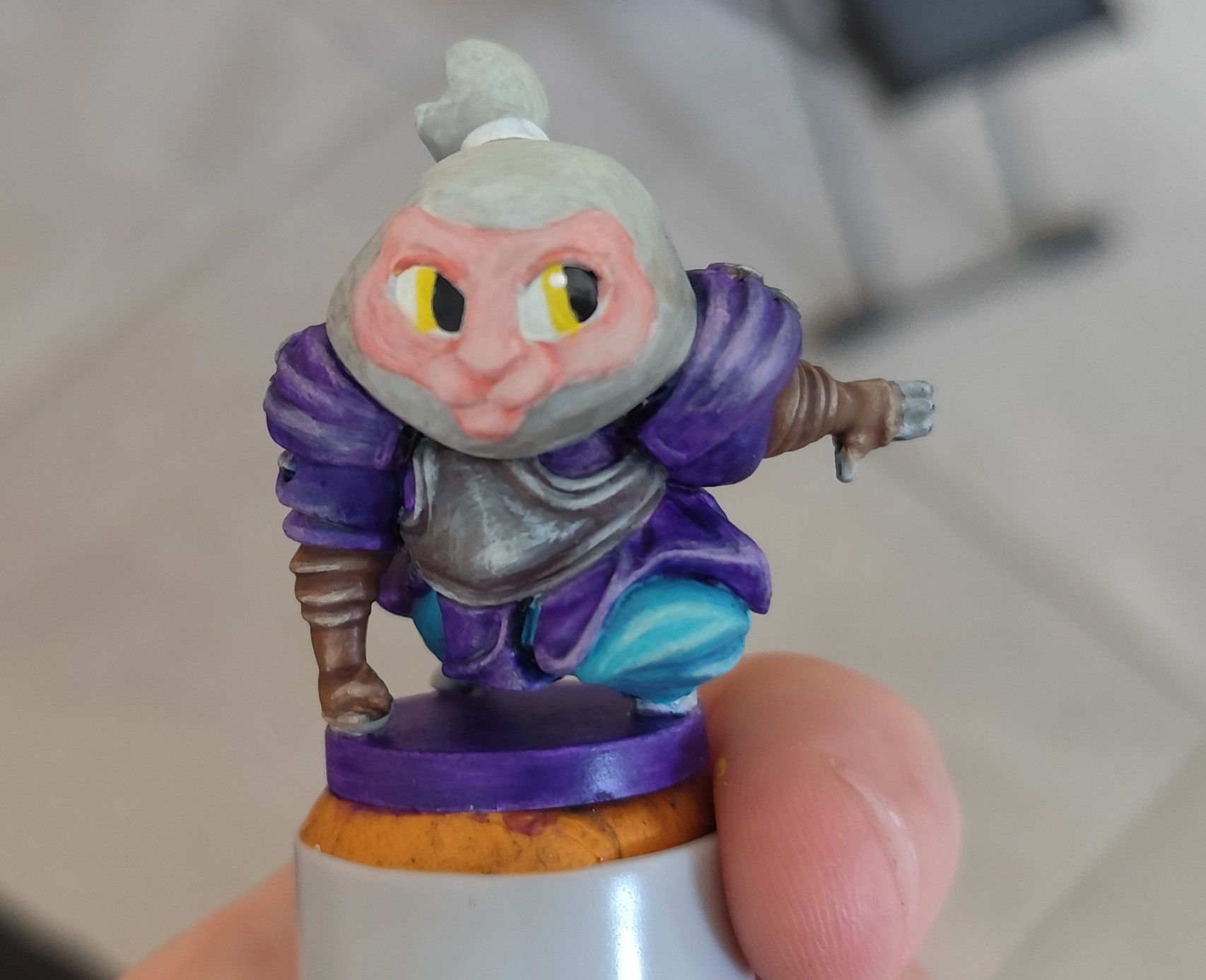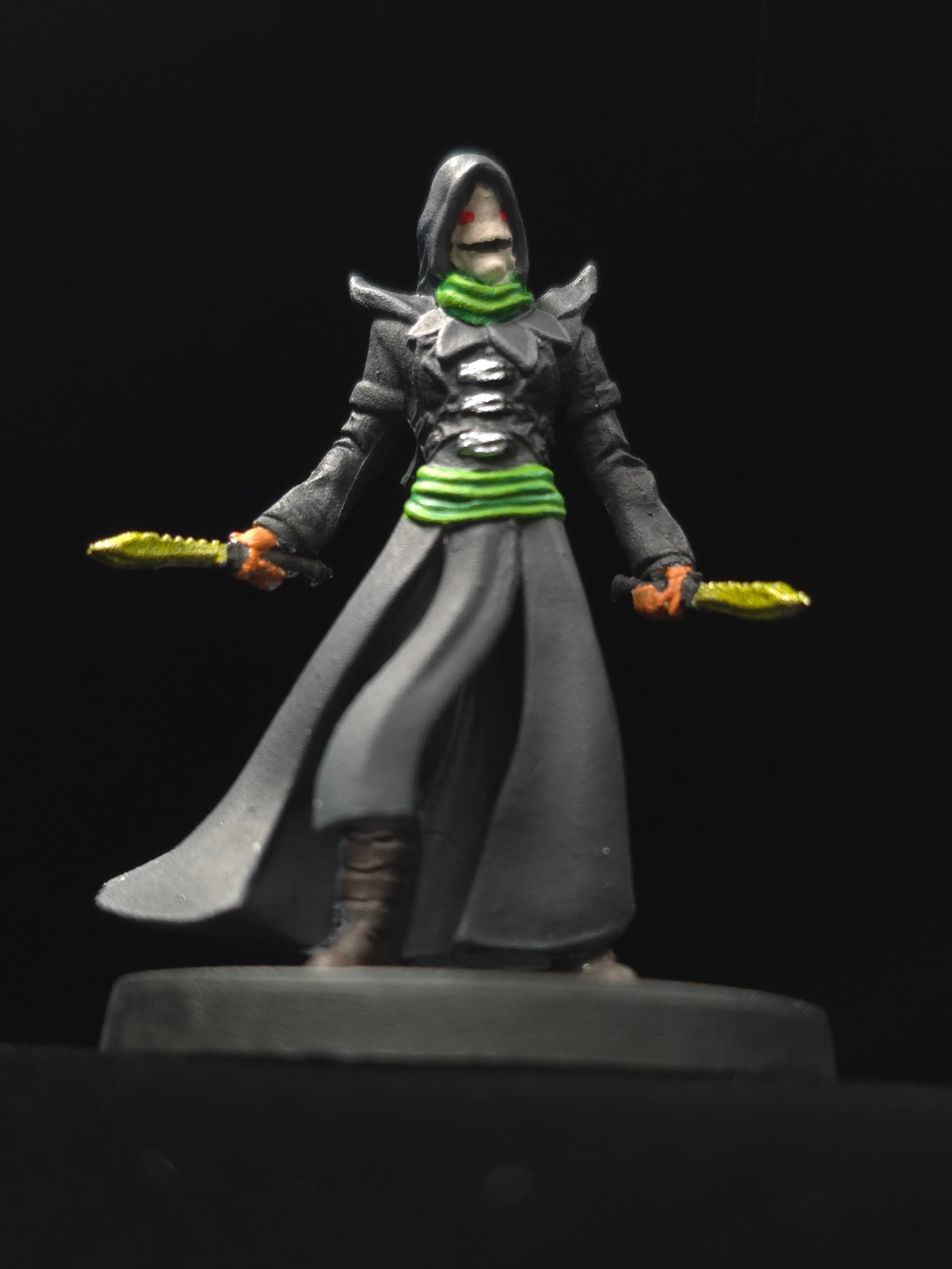 N’ayant pas encore lu les règles/histoire je suis parti dans l’idée de lames empoisonnées et donc de tissu vert pour donner du peps à cette figurine vêtu de noire.