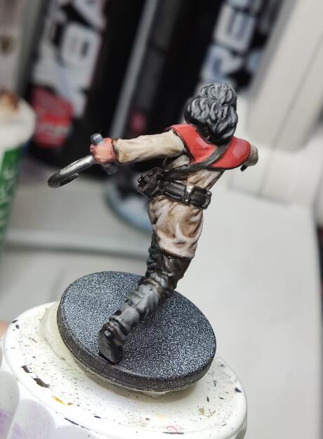 Bien décharger le pinceau et faire le geste du trait en s’approchant de la figurine sans appuyer du tout en frôlant.