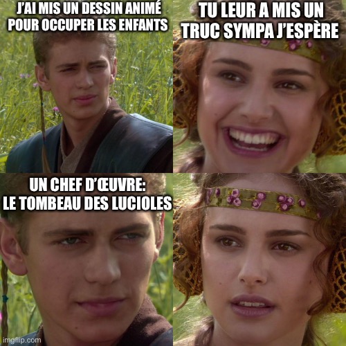 Moi je lâai vu la premiĂšre fois avec mon Ă©cole primaire dans un cinĂ©ma dâarts et dâessai jâai quasiment aucun souvenir autre que le fait de lâavoir vu, mais avec le recul je me demande qui est le psychopathe qui câest dit que câĂ©tait une bonne idĂ©e de montrer le tombeau des lucioles sur Ă©cran de cinĂ©ma Ă toute une classe de CE2