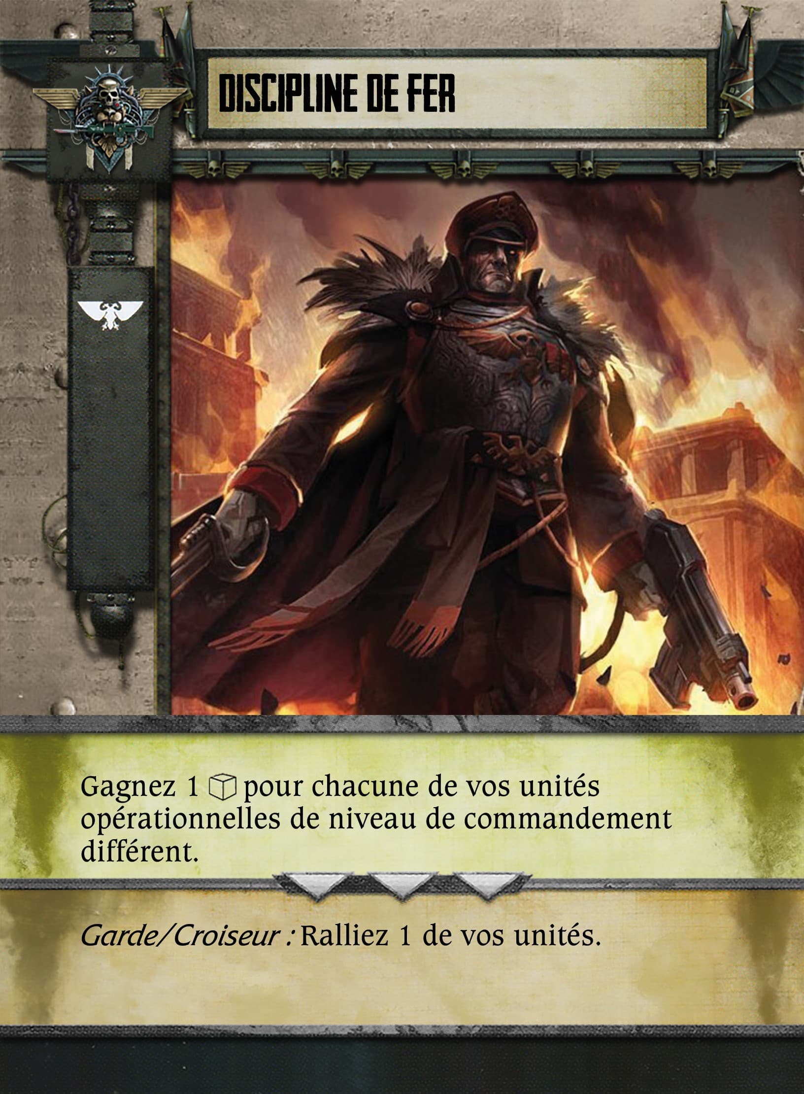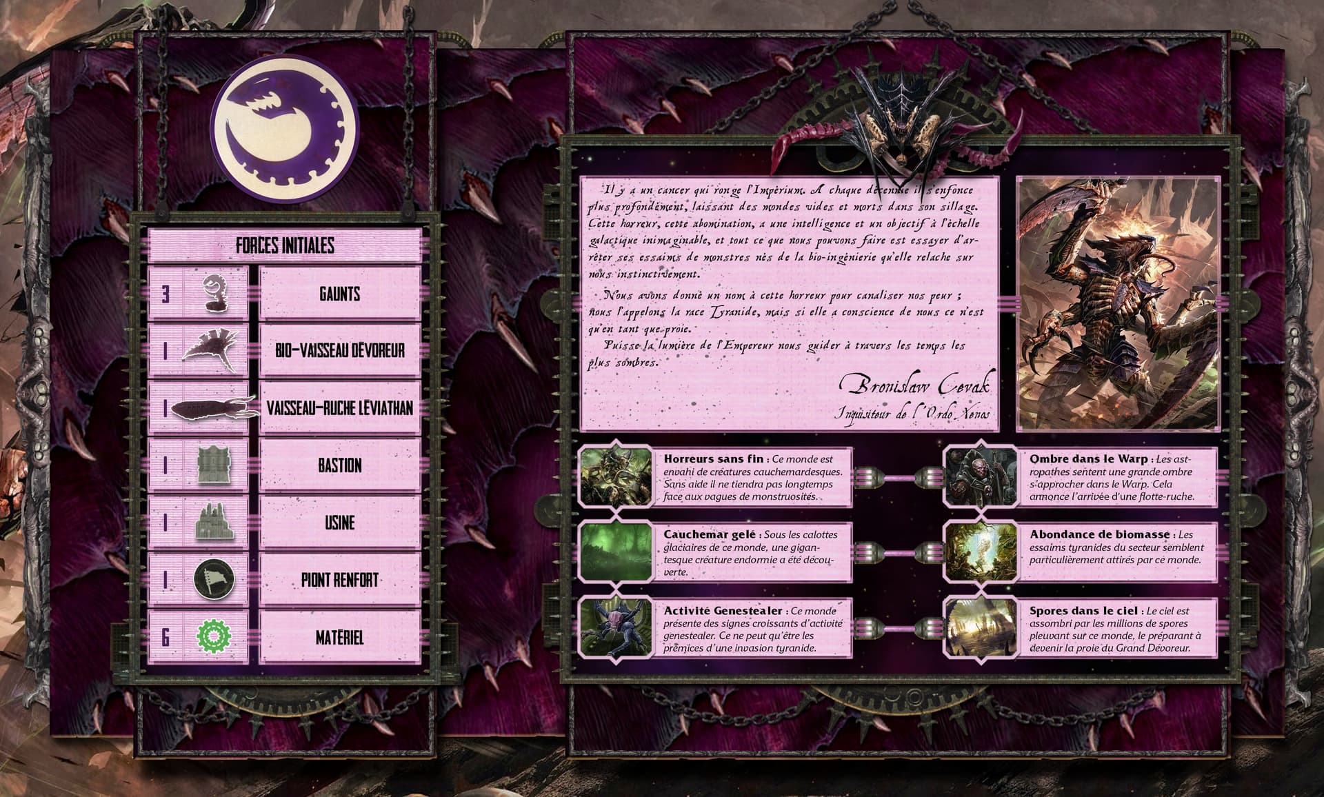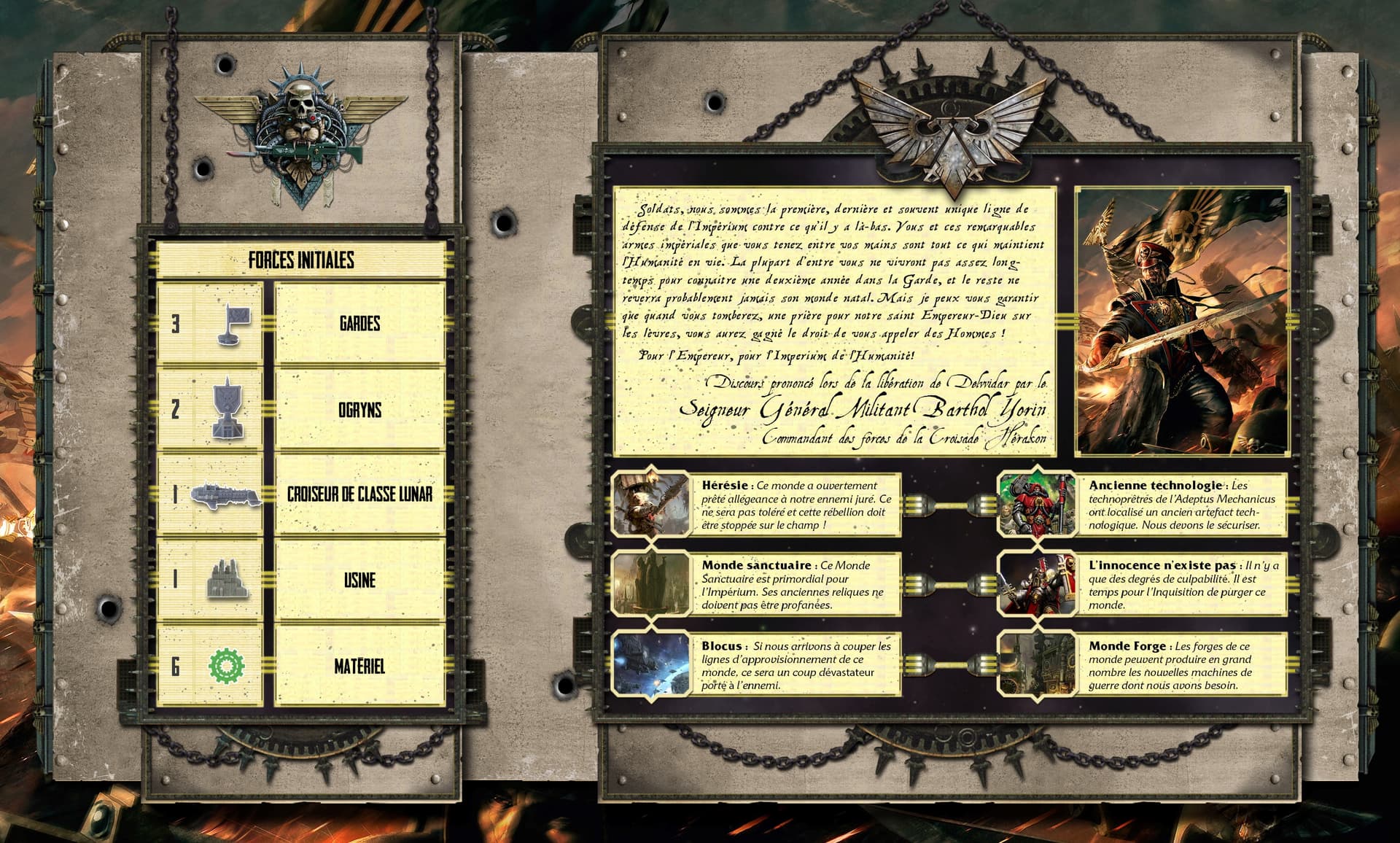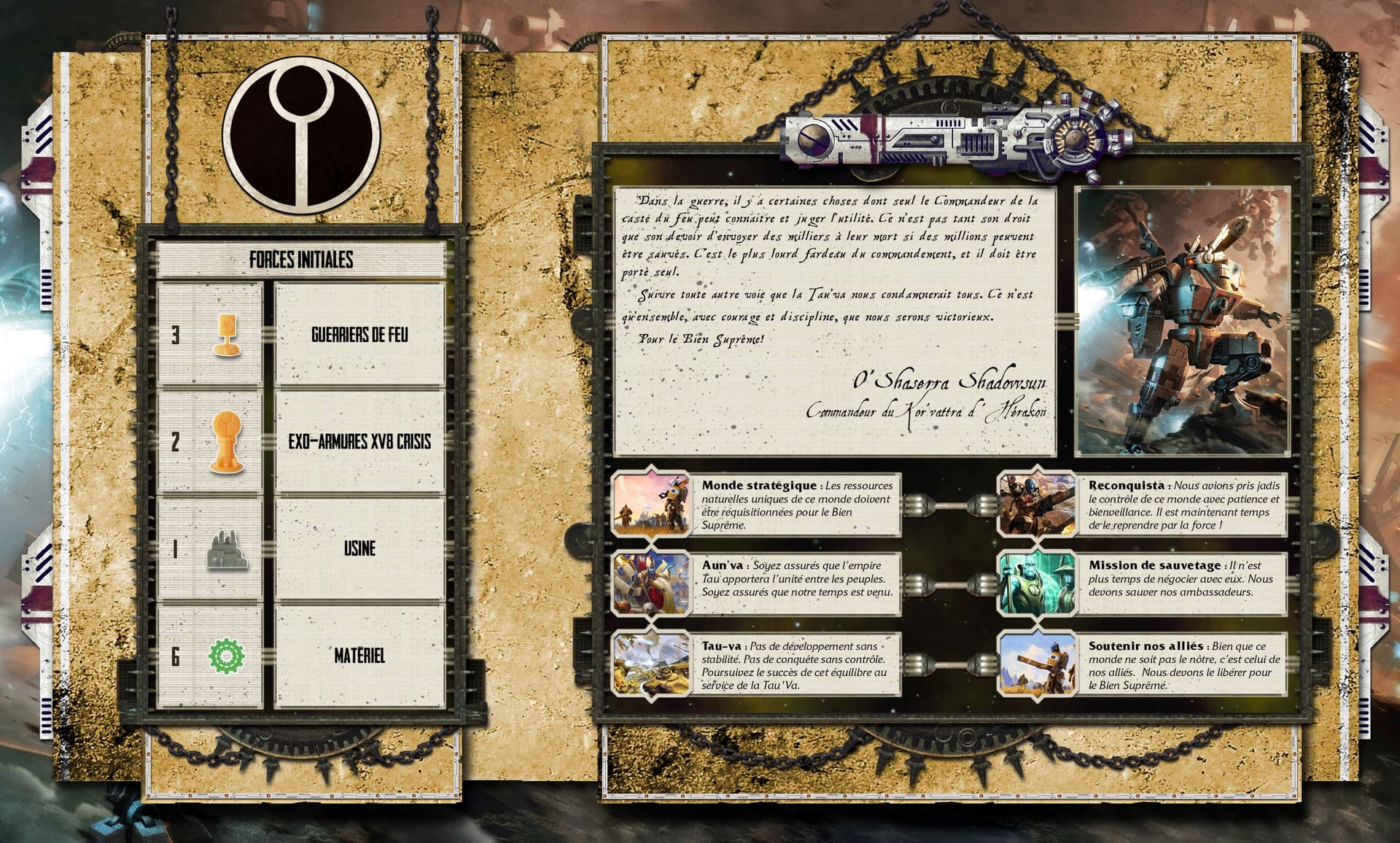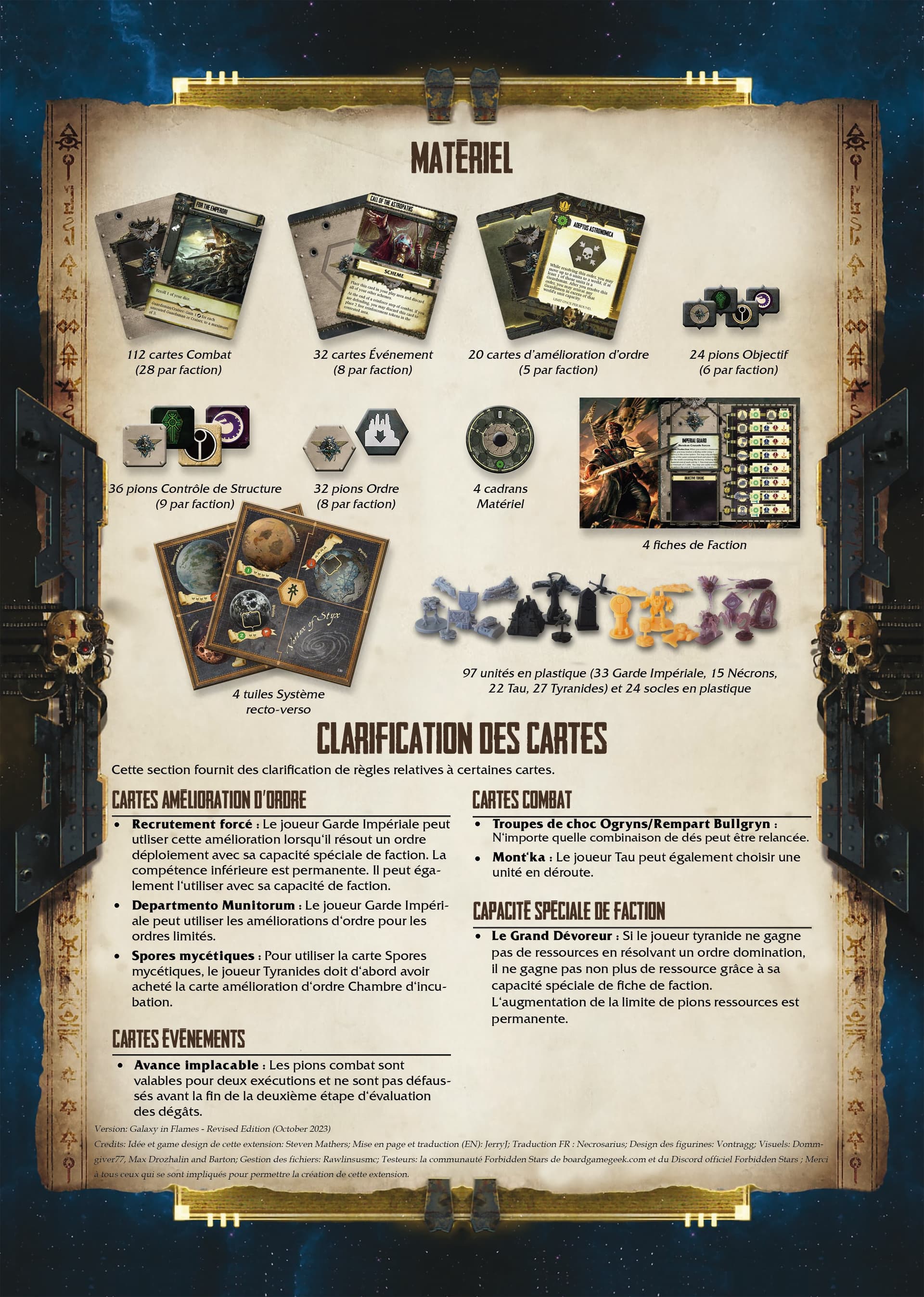 Je publie ici l’ensemble des éléments traduits que j’ai eu. @Fulgrim je veux bien que tu me confirmes s’il manque quelque chose @Tokugawa si tu as le temps de relire le tout pour les fautes de frappe et de mise en page, je veux bien (on passe en MP pour ne pas noyer ici)