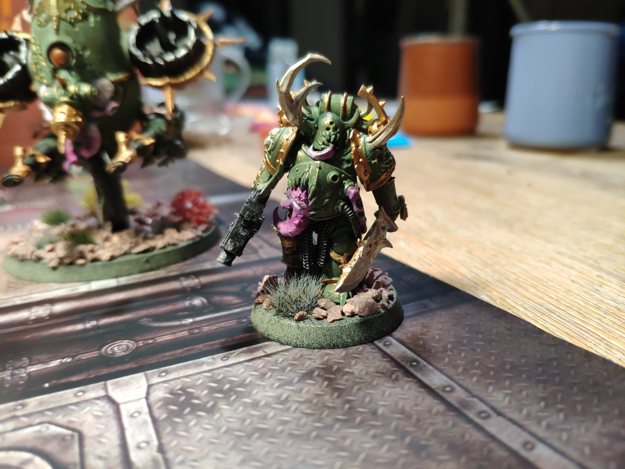Ensuite le death guard il faut le brosser à sec avec du bronze ou du doré pour faire comme si il était couvert de spores ou de pollen (il sert Nurgle, le dieu de la maladie et de la contagion).