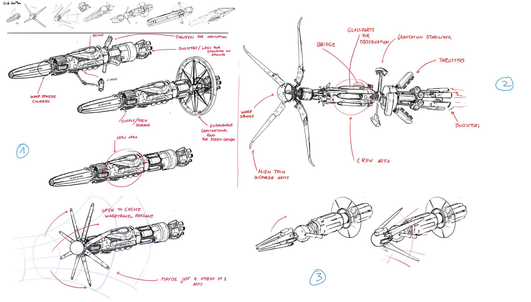 We are working with Dominik on overall look and feel of our Deep Space ship (different from the landing-on-planets ship). Here are the very first ideas and sketches.