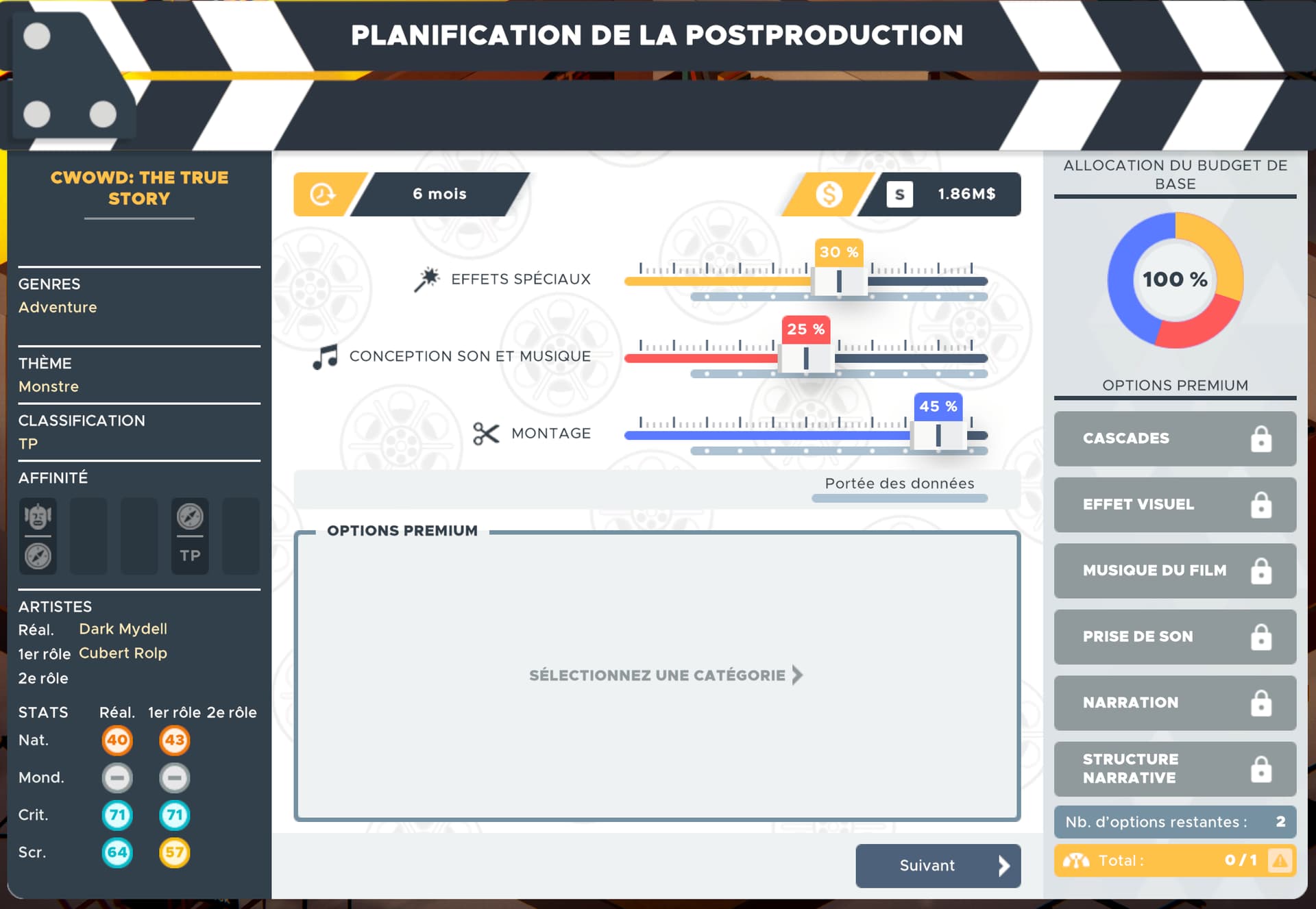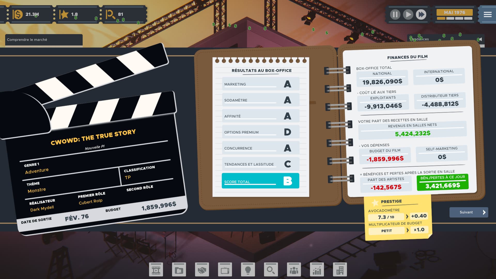 Au fil du temps, on va pouvoir agrandir notre studio, débloquer de nouveaux thèmes (il y en a une pelle), des nouvelles améliorations de pré et post prod, ouvrir des services, on va pouvoir créer des suites, des reboots, des spin off, créer des propriétés intellectuelles, engager du personnel, les former, créer nos coffrets DVD / VHS (éditions essentielle, prestige, etc…), et bien d’autres choses.