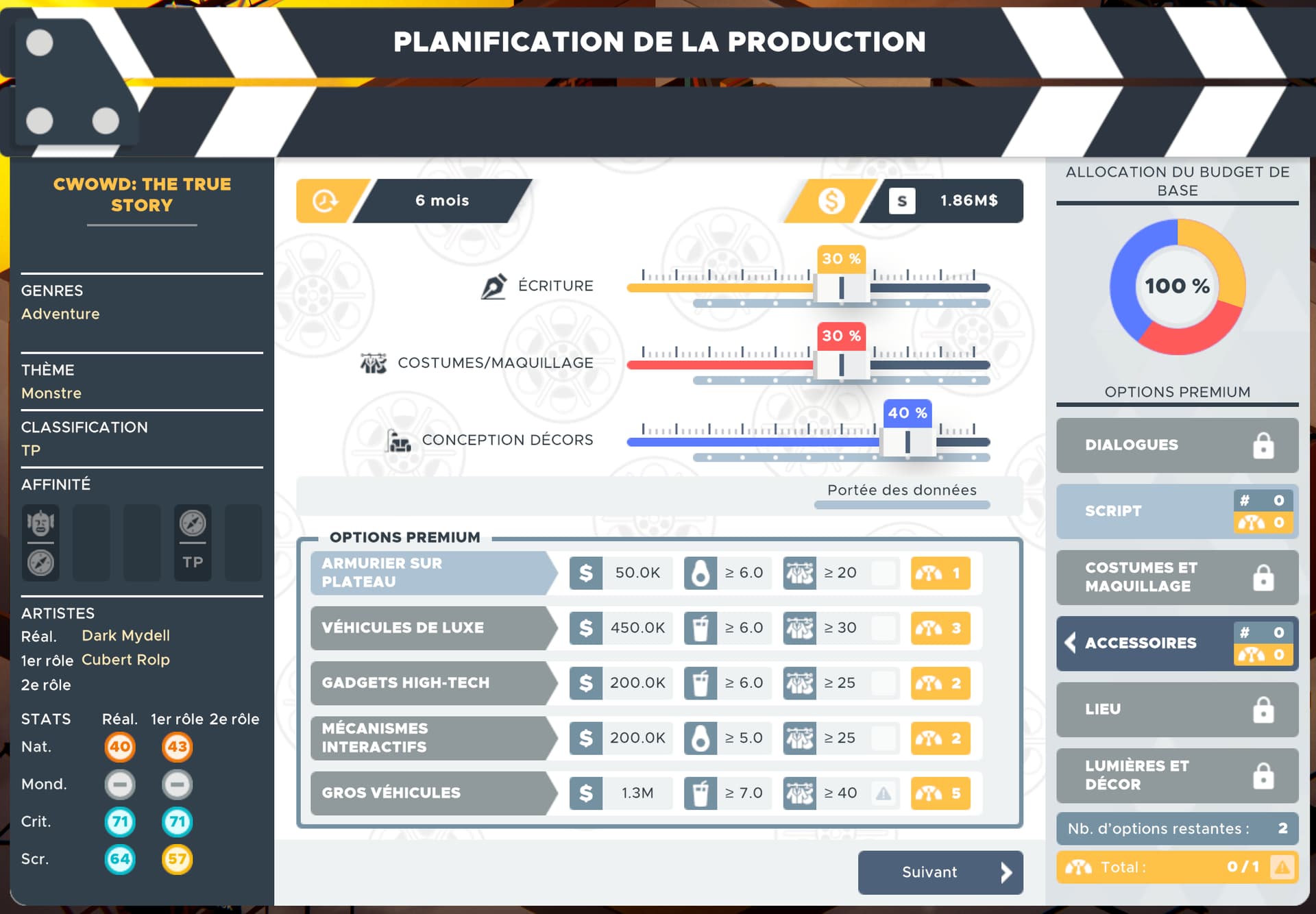 On pourra également rajouter quelques options « premium », à débloquer au fur et à mesure : armurier, véhicules, intrigues, punch lines, tournage extérieur, ambiance, musique orchestrale, construction d’univers, arc narratifs, etc…