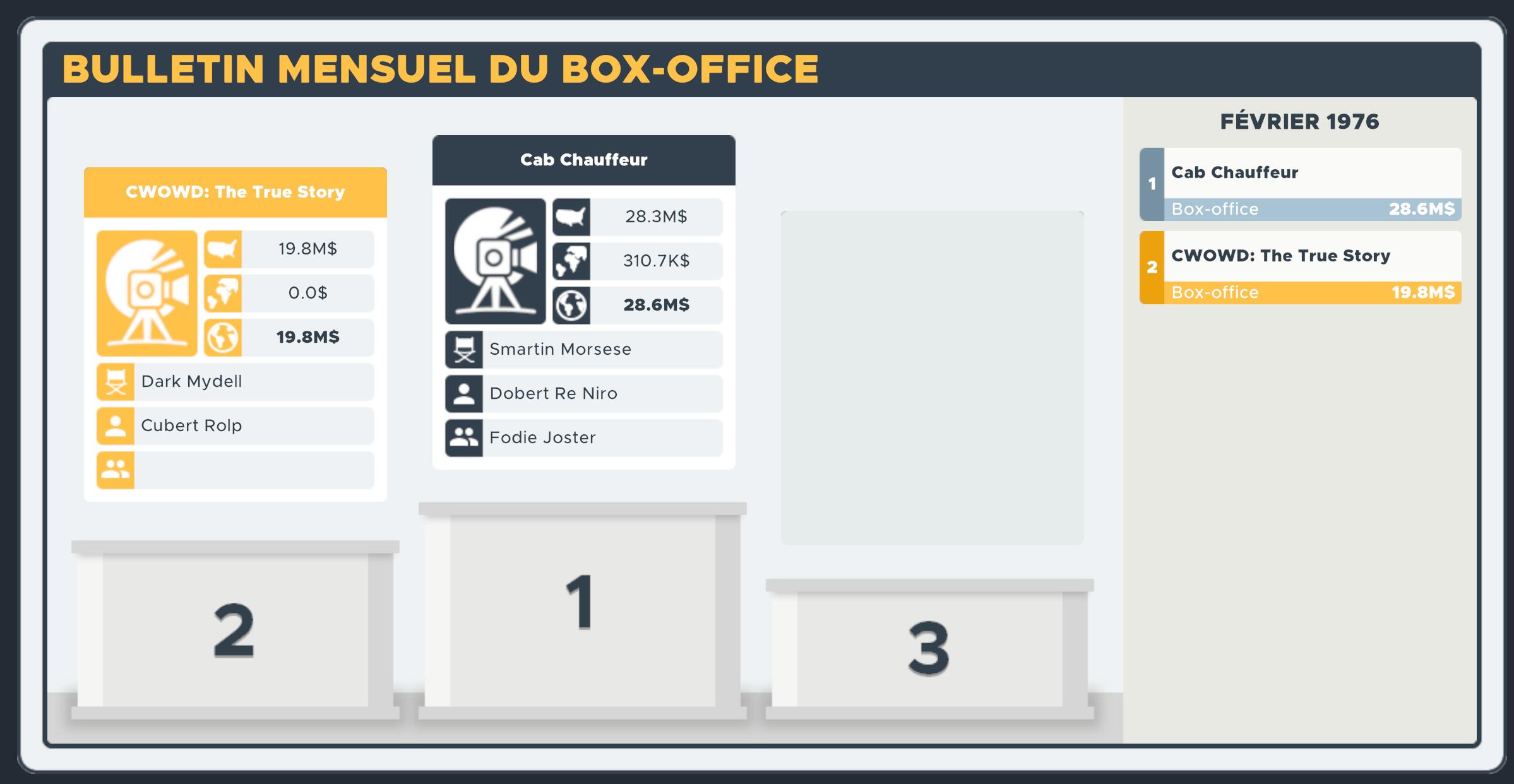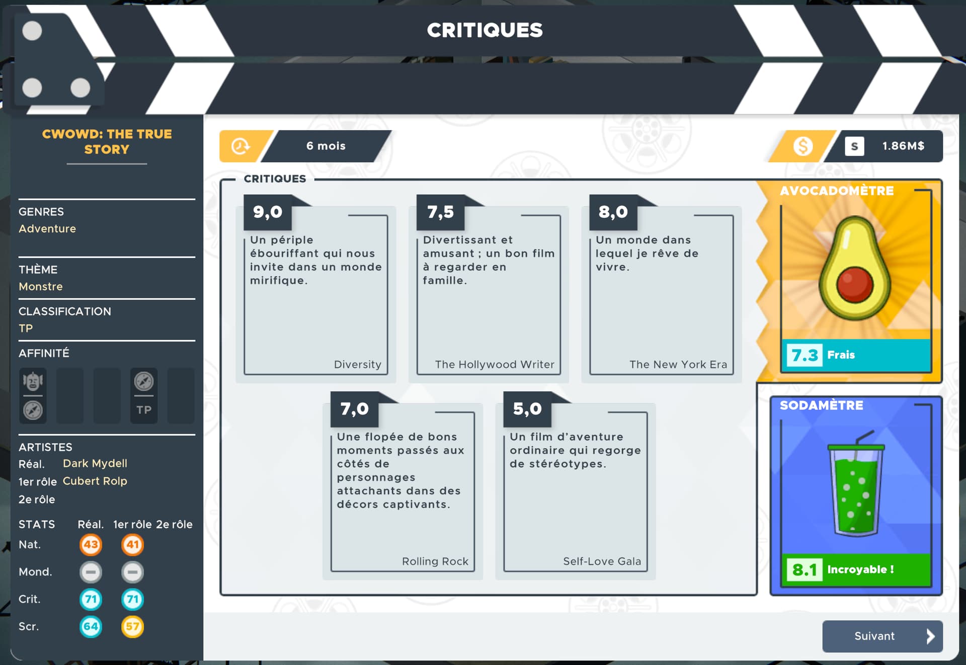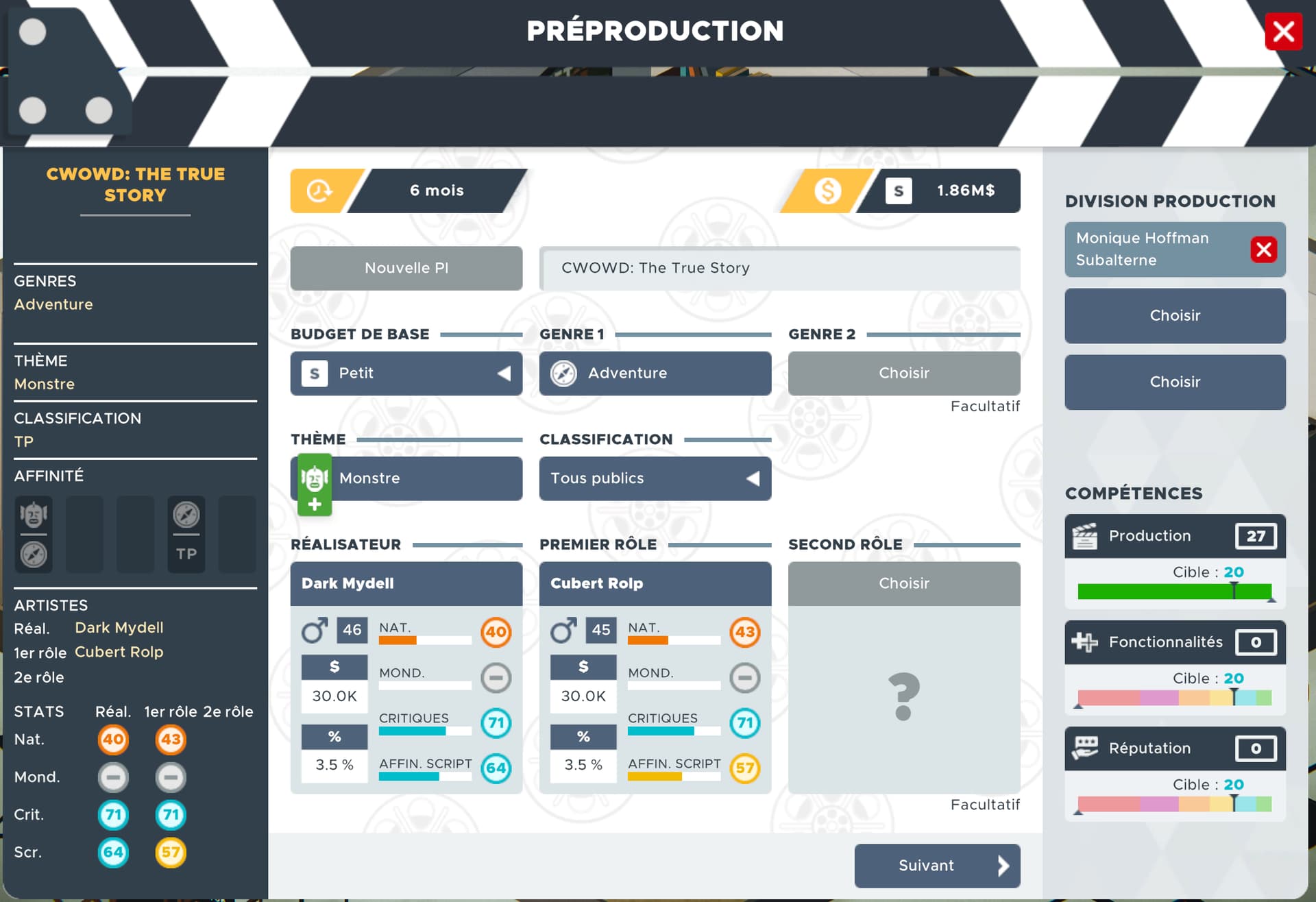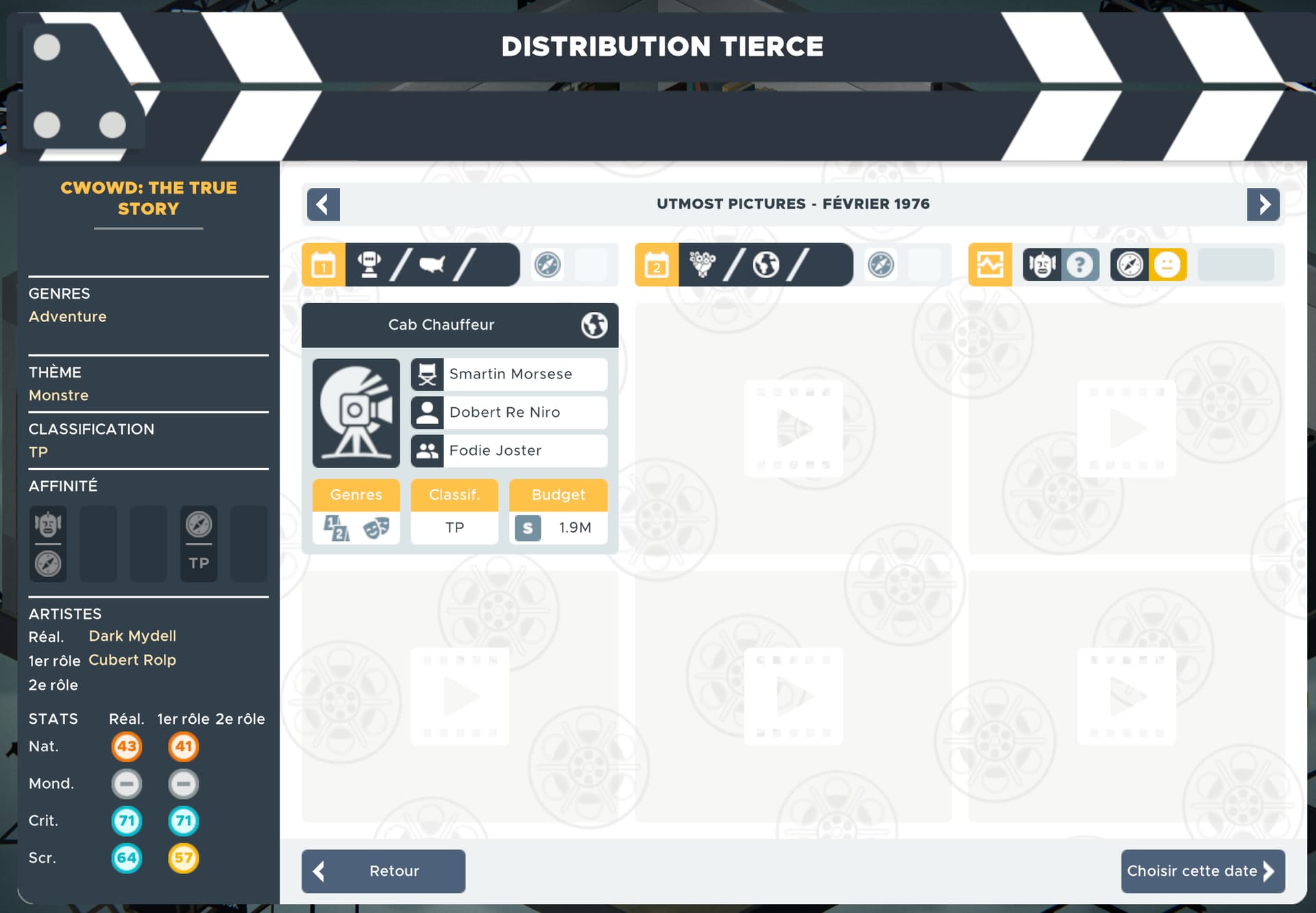 Pour ça, chaque personne qui sera potentiellement intéressé par votre film (selon votre réputation) va avoir plusieurs notes (succès national, international, presse, atomes crochus avec le script), et bien sûr un coût.