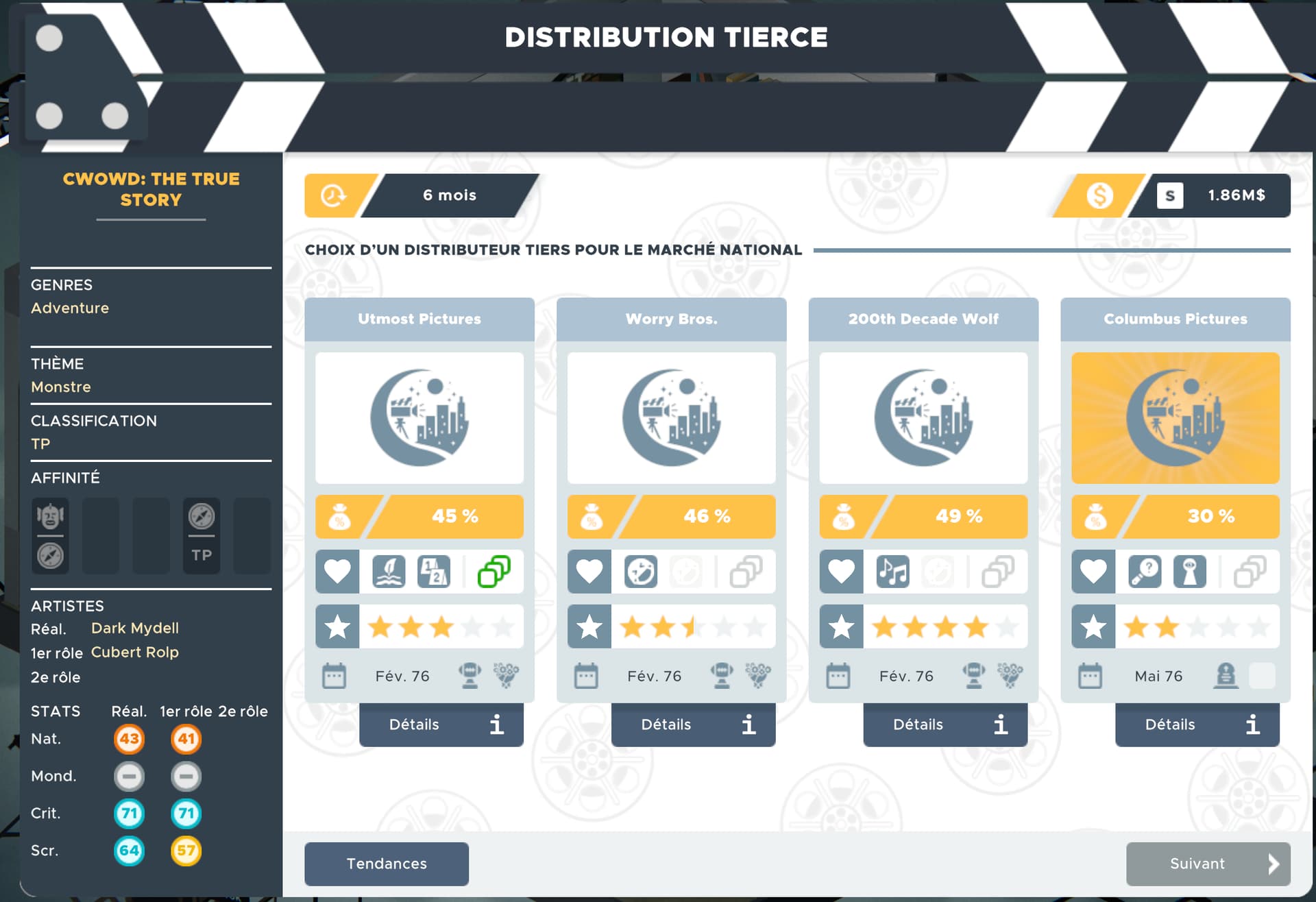 Une fois terminé, il est temps de trouver un distributeur. Au début du jeu, on ne pourra que faire des distribuitions à l’échelle nationale. Mais plus tard, ça sera dans le monde entier