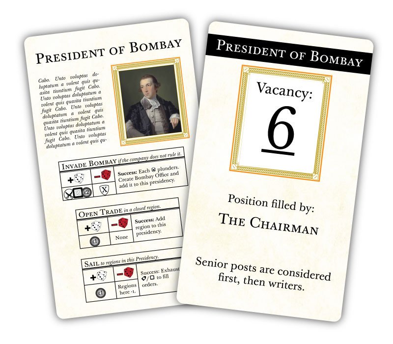 Quelques pensées de la John Company ce dimanche matin : Pendant très longtemps, la John Company a été entièrement basée sur la carte. Mais, comme le jeu devenait de plus en plus compliqué, j'ai fini par pivoter vers un plateau. Les actions en elles-mêmes ne sont pas trop difficiles, mais pour un nouveau joueur, il y a beaucoup de choses qui se passent. En outre, le manque de cartes a augmenté le degré auquel le jeu a exigé un joueur modérateur pour gérer les choses en douceur.j'ai remarqué que les jeux de John Company varient énormément en longueur. Une raison en est évidente : certains groupes négocient tout. Mais ce qui est tout aussi important, j'ai constaté que les groupes avec un modérateur fort réduisent le temps de jeu de moitié, ce qui fait que l'un des objectifs de la deuxième édition est de réduire la demande sur un modérateur. Cela signifie qu'il faut mettre en place beaucoup plus d'aides au jeu et modifier quelques phases pour qu'il y ait moins d'interruptions et que les cartes de bureau sont de retour. Ne vous inquiétez pas, le plateau est toujours là, mais elle est beaucoup plus simple et plus petite. Maintenant les joueurs auront une carte de bureau pour chaque bureau qu'ils occupent. Le recto de la carte contiendra des rappels utiles :
