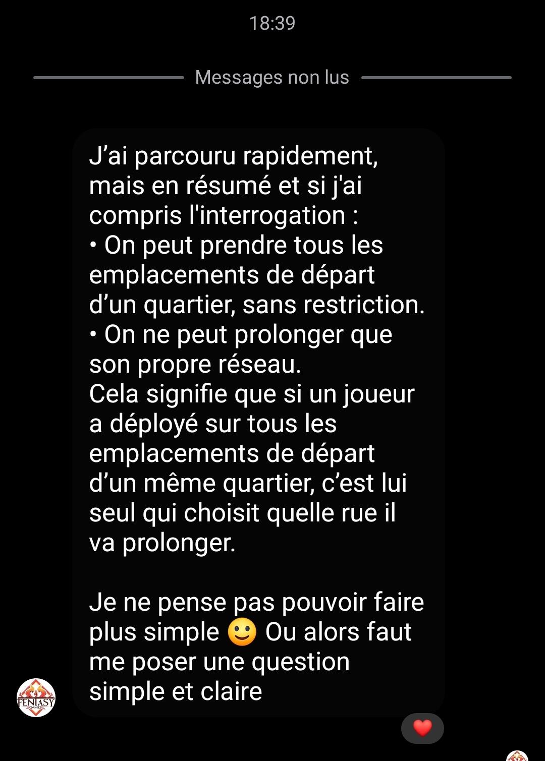 Je suis d’accord avec @notoriousfab sur tout et c’est un membre de l’équipe d’édition qui m’a expliqué le jeu a Montbéliard. Le seul truc un peu chelou c’est cette histoire de réseau qui relie 2 quartiers: comme dit plus haut on ne peut pas continuer un réseau qui passe exclusivement par le 2e quartier avec une carte du premier. Par contre si deux quartiers sont reliés on peut très bien utiliser une carte de l’un ou l’autre pour faire un embranchement. Ya assez peu de cas où c’est un problème : typiquement les rues sans embranchement entre 2 quartiers au bord de la map. mzis si ya un embranchement au milieu alors le réseau peut s’étendre par la. En fait c’est super chiant a expliquer avec des mots, faut des images.