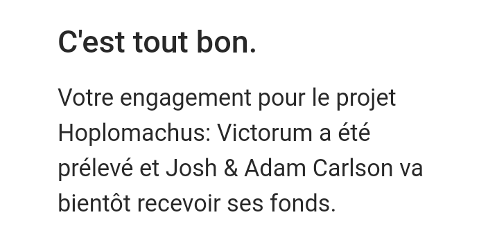 Mauvaise nouvelle : nous n’avons pas pu traiter votre engagement pour le projet Hoplomachus: Victorum. La récompense que vous aviez sélectionnée, proposée en nombre limité, est épuisée. Si vous n’avez pas reçu de confirmation de notre part, votre engagement n’a pas été pris en compte. Vous pouvez ignorer les e-mails d’autorisation reçus de notre service de traitement des paiements.