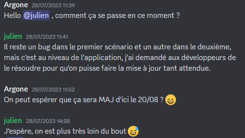 Début juillet, il a reçu une version beta de l’appli corrigée et avec les voix qu’il a encore une dernière fois testée et fait testé à des membres du discord qui le souhaitaient.