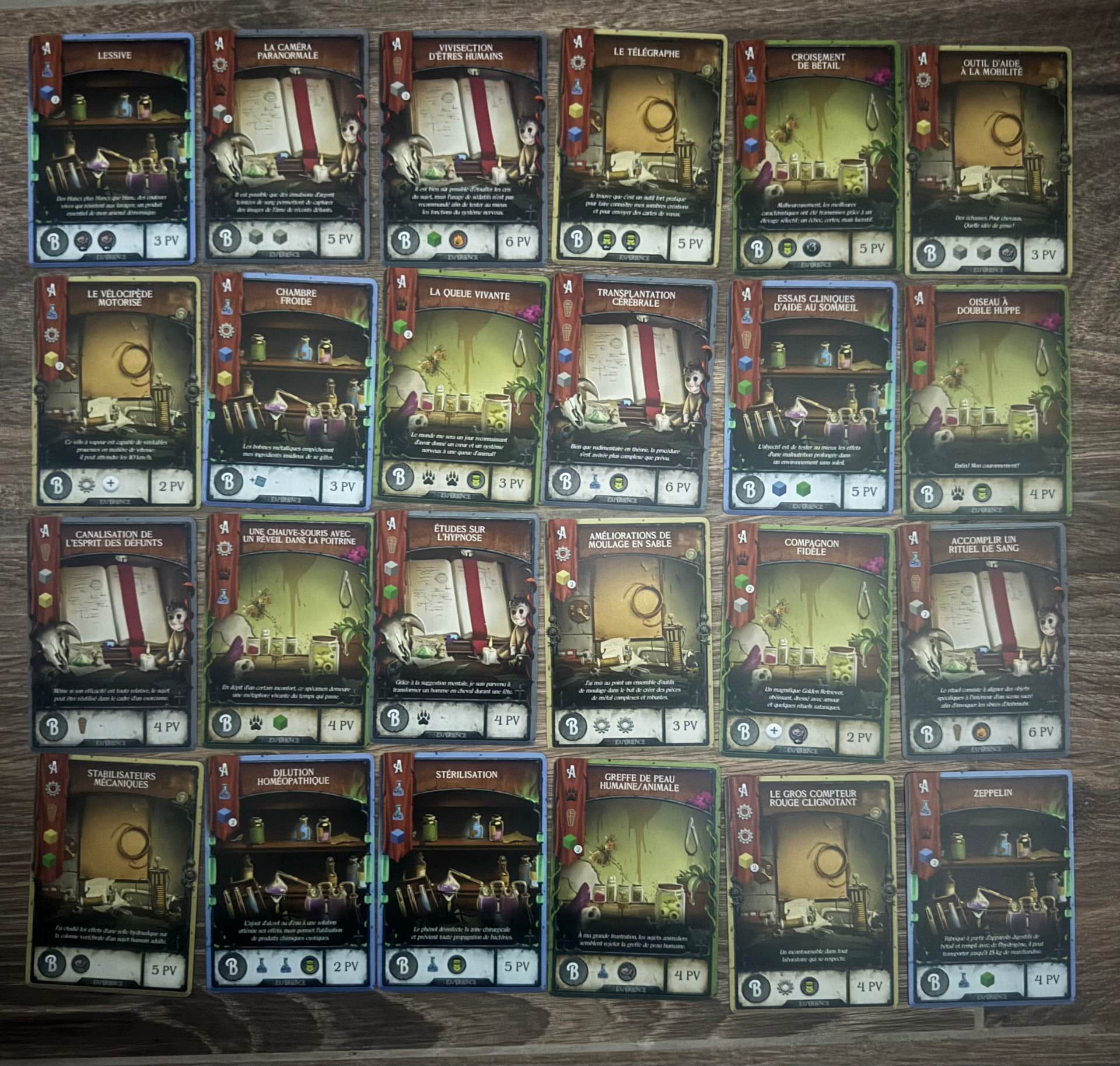 Edit 3 : le nombre de cartes pour les scénarios étant marqué au dos, j’ai pu compter ! (oui je suis débile ><) J’ai tout ce qu’il faut pour le 1er (18 “obsession”, 5 “expérience”, 1 “amélioration du grand oeuvre”, 1 “traumatisme” mais… les 2e et 3e scénarios ont leurs cartes toujours sous cello. Glurps.