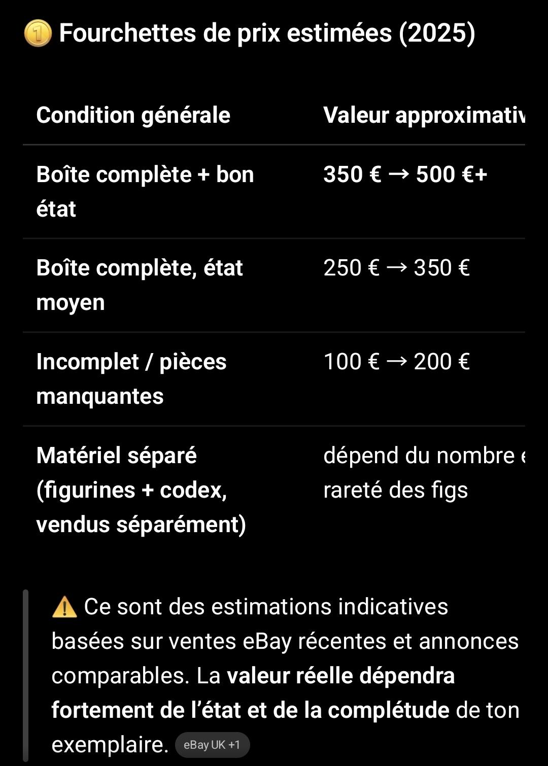 100 € si incomplet, vers 250 € si complet (150 € si tu brades vite, 100€ sera pour un ami).