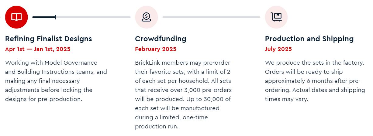 A cette date, rien ne sera encore produit (comme KS) mais la livraison commencera en juillet 2025 (c’est assez rapide comparé aux autres sets Bricklink où on était sur 1 an d’attente)