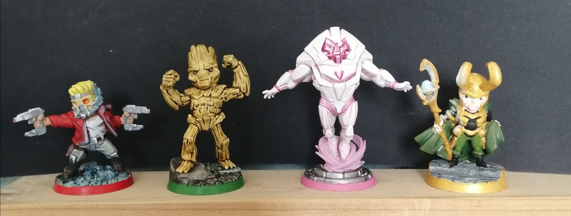 Du coup, alors que j’avais fait une croix sur mon APO même pas commencée, on s’y est mis ensemble sur une session de 2h30 hier. Elle a fait Loki, moi Nimrod et Star-Lord et ce matin, j’ai fait Groot, la figurine la plus rapide à peindre de la galaxie pour un rendu plutôt pas mal (Constrast Aggaros Dunes)