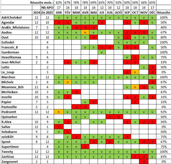 sur les 12 APO: @tweety et @AdriChninkel (qui renouvellent leur exploit de 2024) et @marchen (déjà à 100% l’année dernière, mais sur seulement 6 participations)