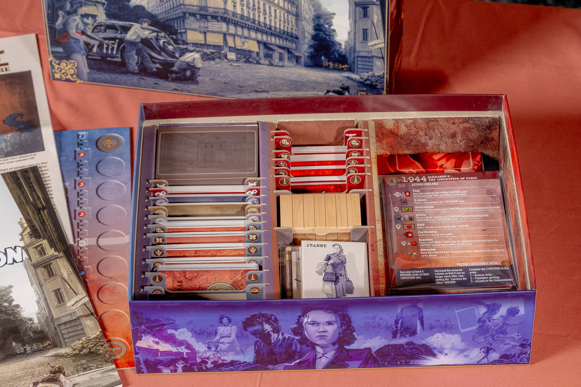 Concernant les séquences de jeu, on travaille encore sur le livret de règle et des aides de jeux vont arriver, par scénario. Après, franchement, lorsque tu auras joué à une première partie, le séquencement est très simple, la mise en place, au final parfaitement intuitive et bien expliqué même si on cherche à la rendre encore plus fluide. Le résistant1 joue, l’opposant joue, le résistant2 joue, l’opposant joue … Il n’y a pas comme dans Air Postal la problématique d’aller sur le plateau air support avec des twists intéressants mais pas facile à comprendre en lisant uniquement la règle avant de se lancer dans un vol.