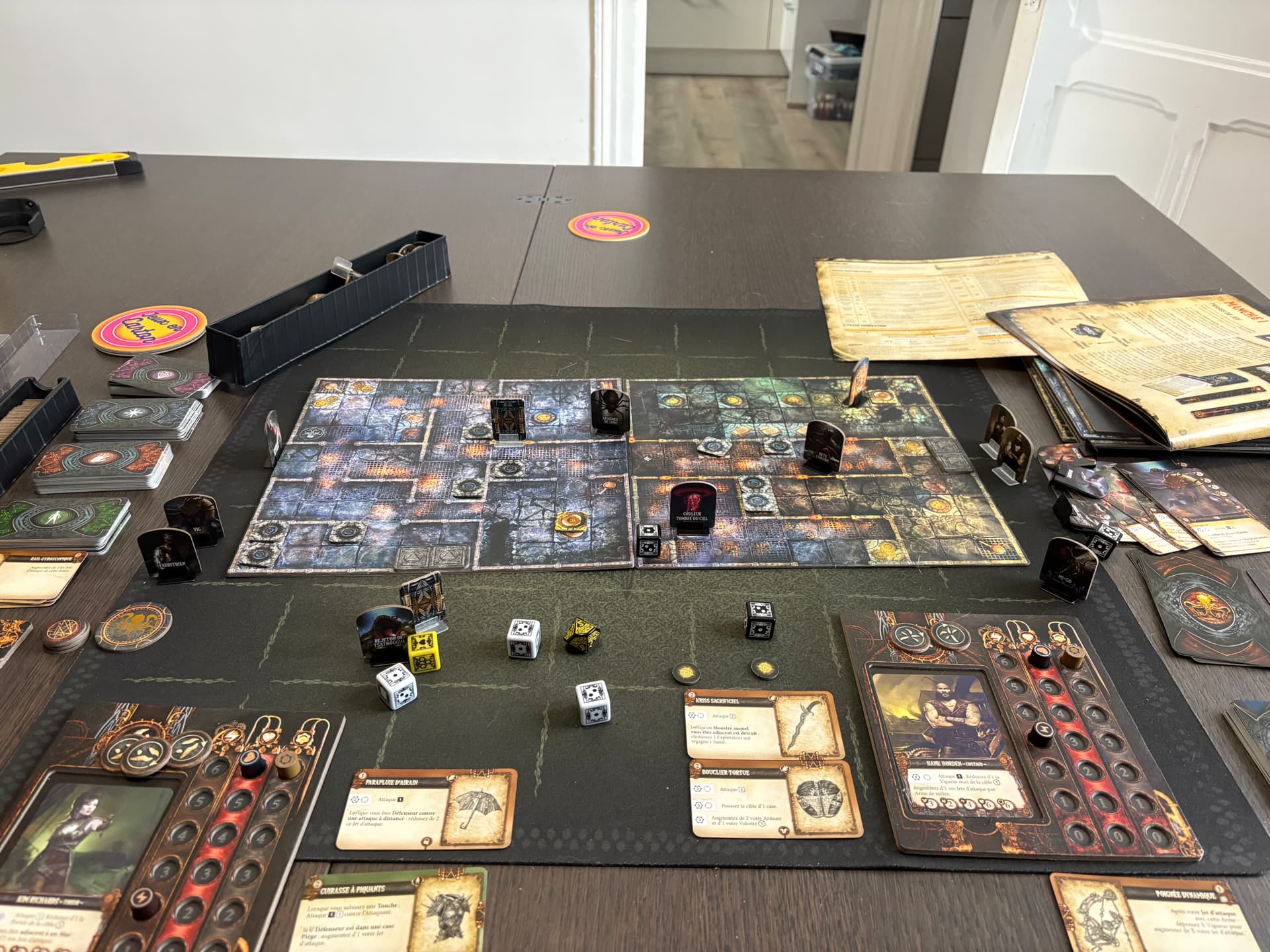 - Sous Tabletopia, on ne dispose que du matériel de la Corebox, donc les paquets d’équipements sont épurés, et j’ai trouvé qu’on avait vraiment moins de mal à les faire tourner pour obtenir ce qu’on voulait. Pareil pour les monstres, certains « gros chiants » des extensions n’étant pas là, ca a simplifié.