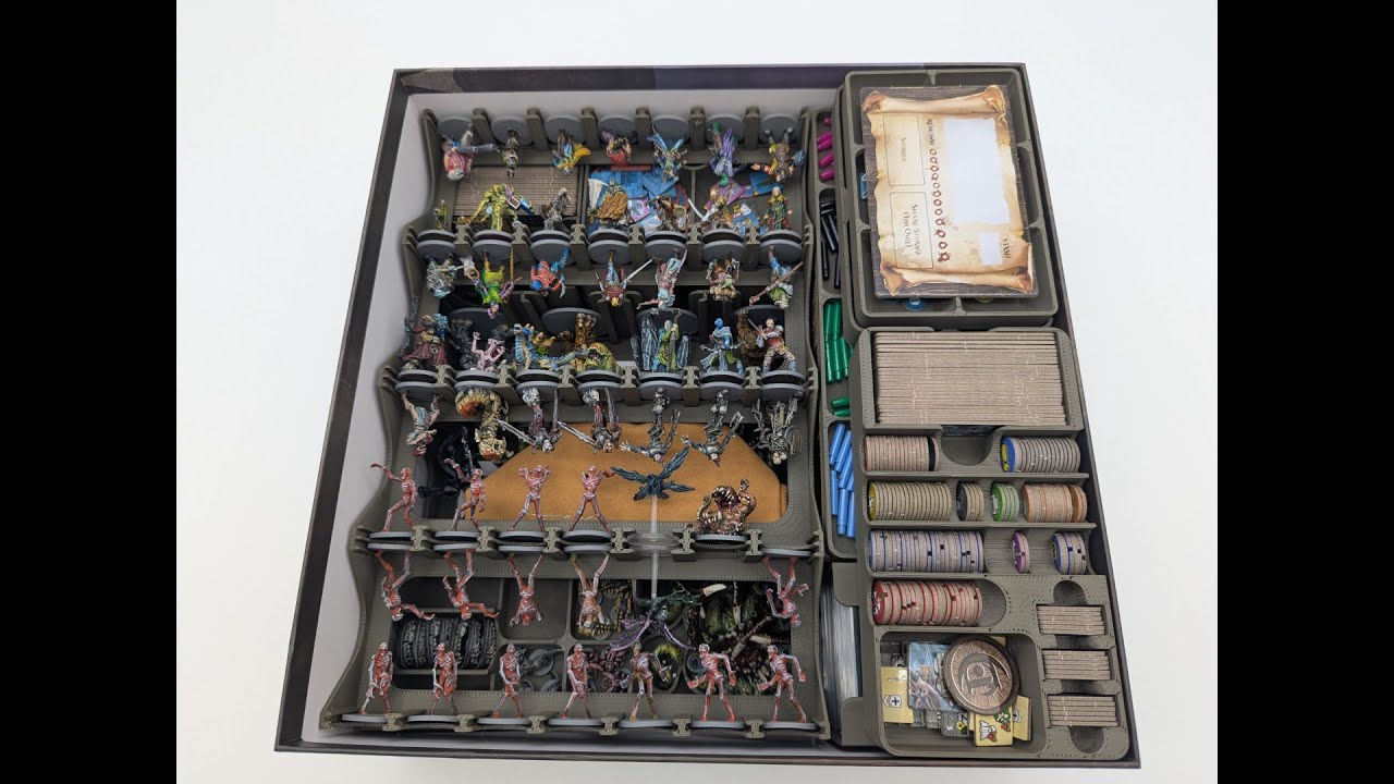 Pour rappel, cet insert est conçu pour contenir l’intégralité du contenu de la gamme Maladum (sauf les décors 3D) listé ci-dessous, soigneusement rangé dans la boîte de base d’origine :