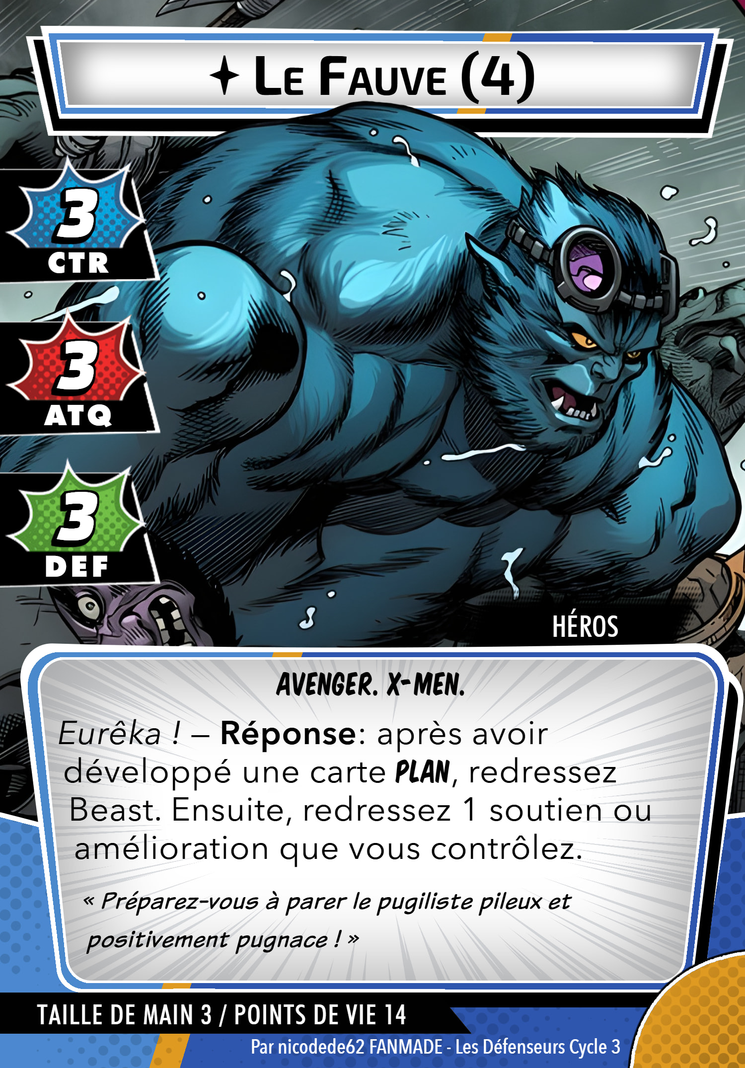 Mutations Secondaires Le Fauve est un mutant brillant, avec un long passé de mutations et d’expérimentations. Cela se reflète dans sa capacité d’alter ego, qui vous permet de dépenser des ressources mentales et de remplacer votre carte d’identité actuelle par le niveau supérieur, en gagnant à chaque fois de meilleures caractéristiques (mais avec une taille de main plus faible).