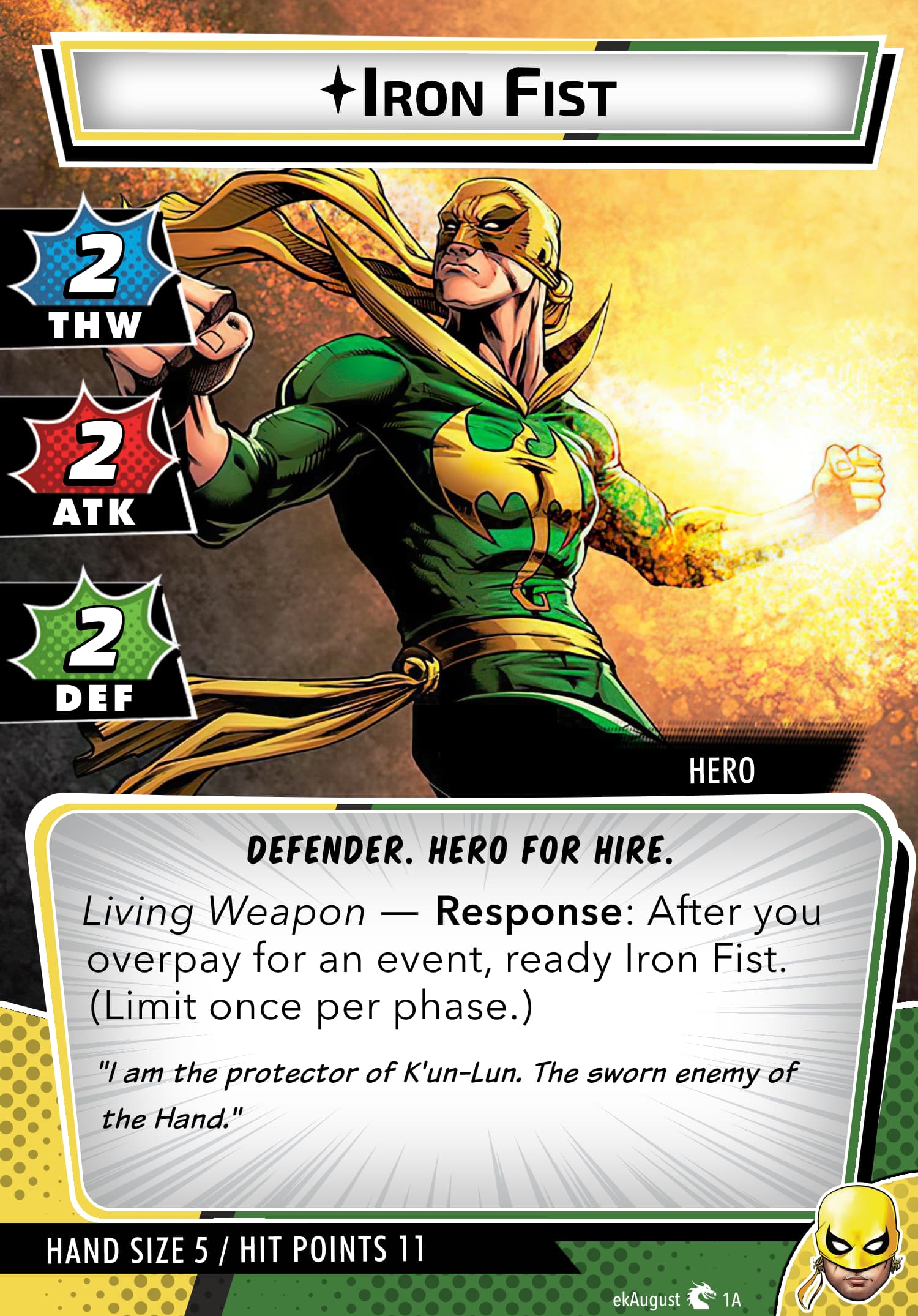 Alors, iron fist aura un nouveau mot clé, assez intuitif mais il faudra que je l’harmonise car une carte de luke cage l’utilise: