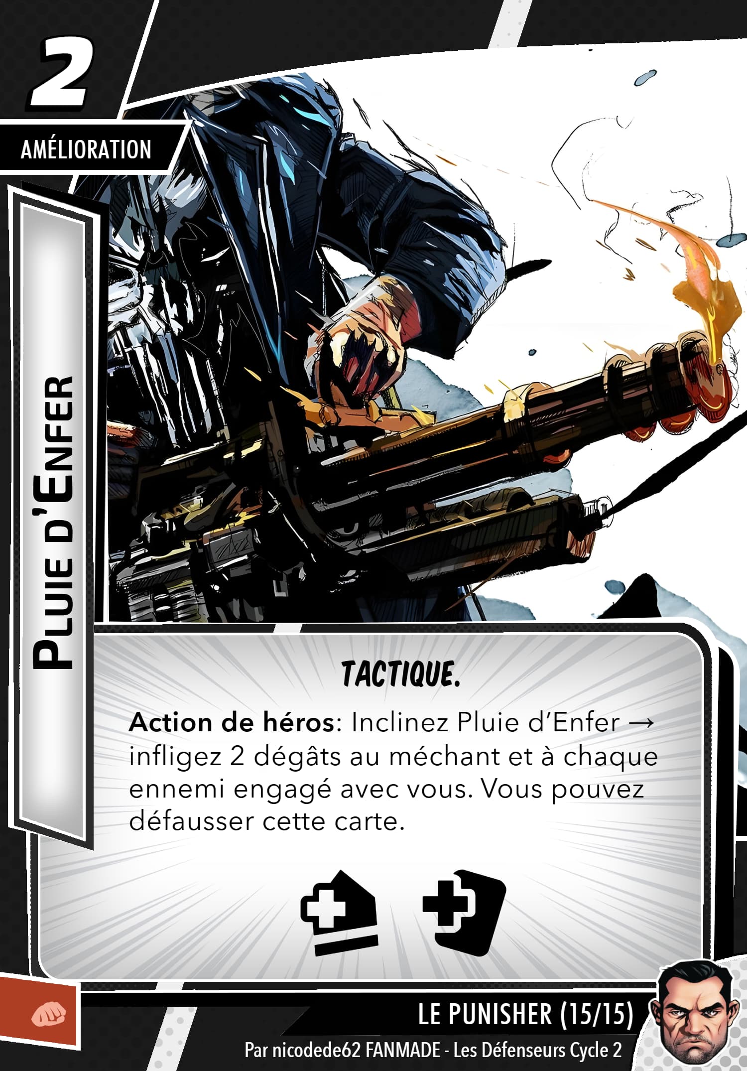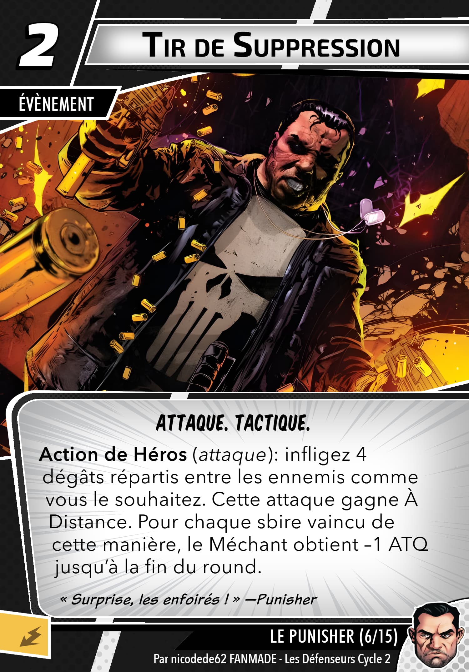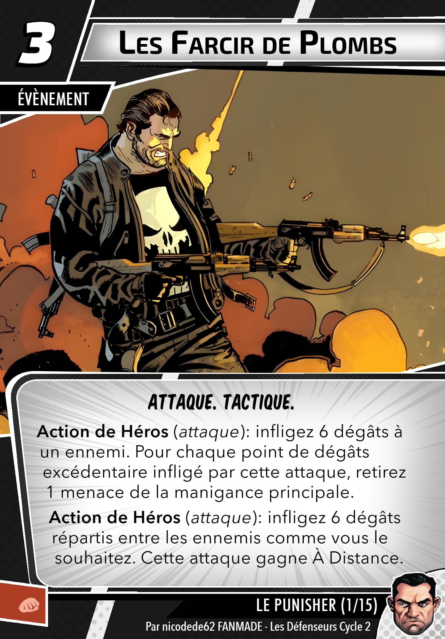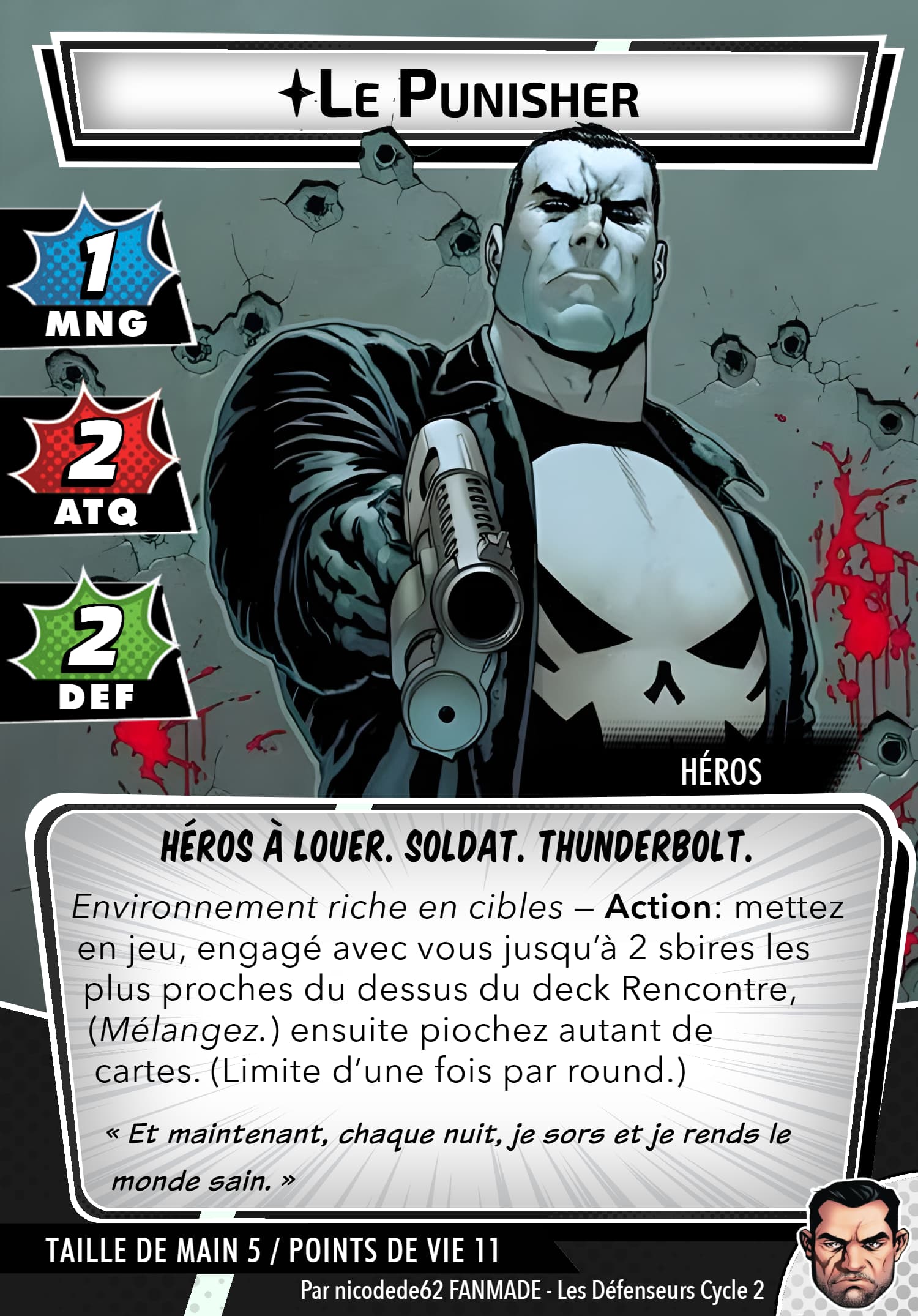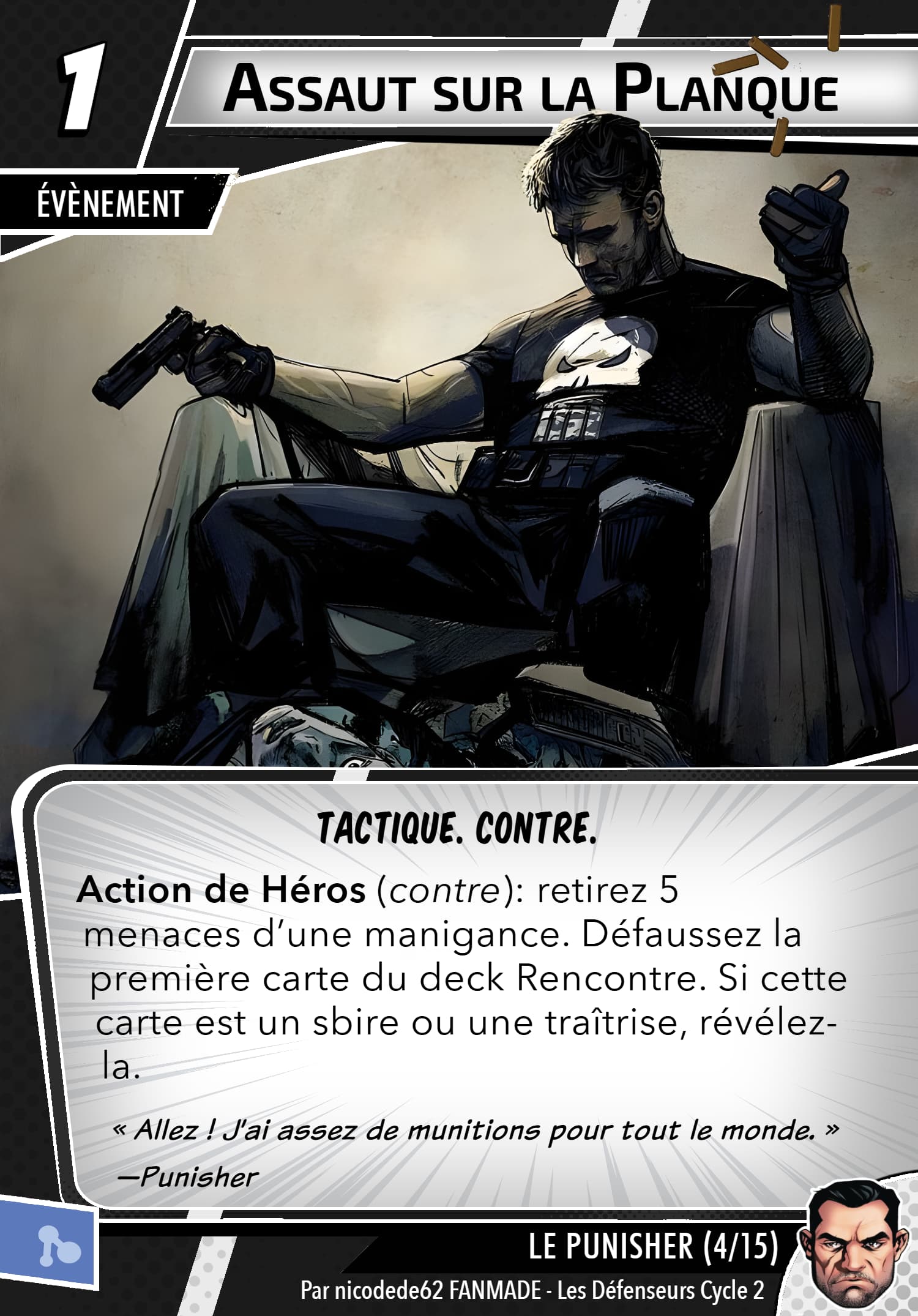 Mais rassurez vous, le punisher possède un arsenal digne d’une artillerie, sa capacité de setup permet de prendre les cartes qu’ils faut, j’en ai déjà repéré des superbes en agressif, justice et même protection, inexistant quasiment en cmd. Ça reste thématique…