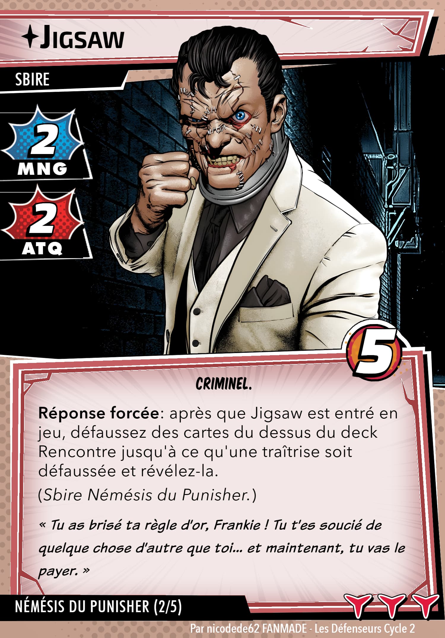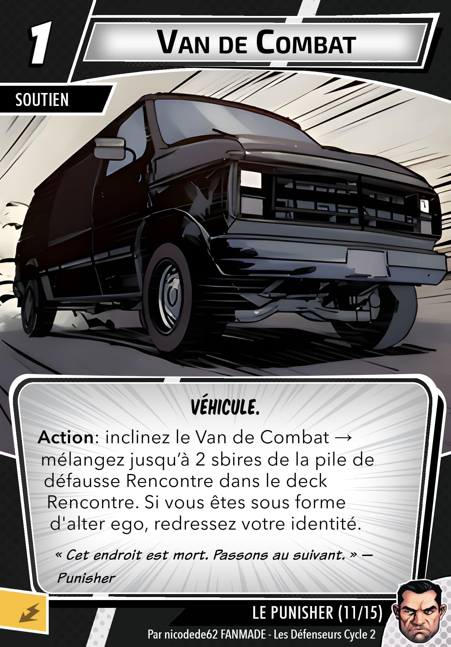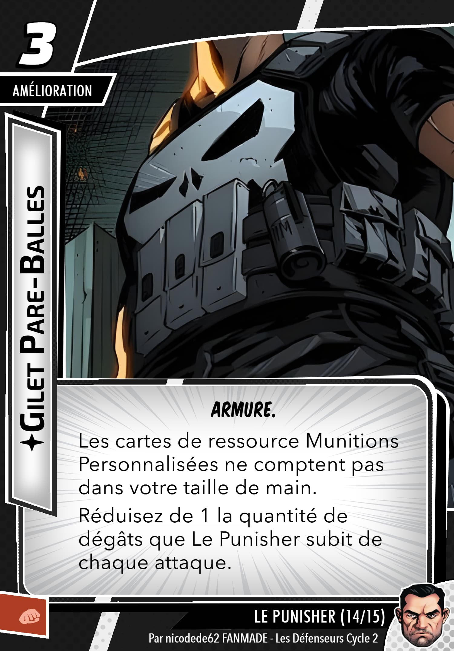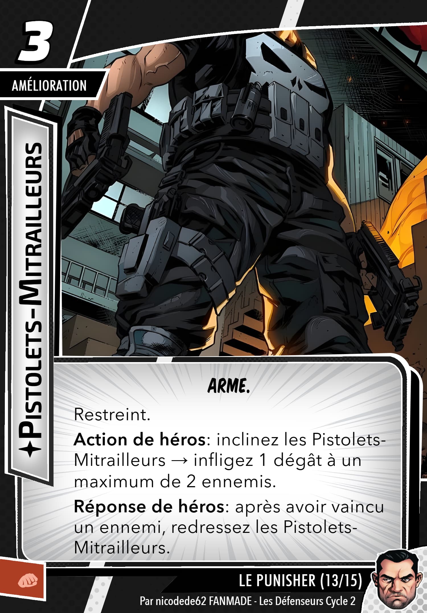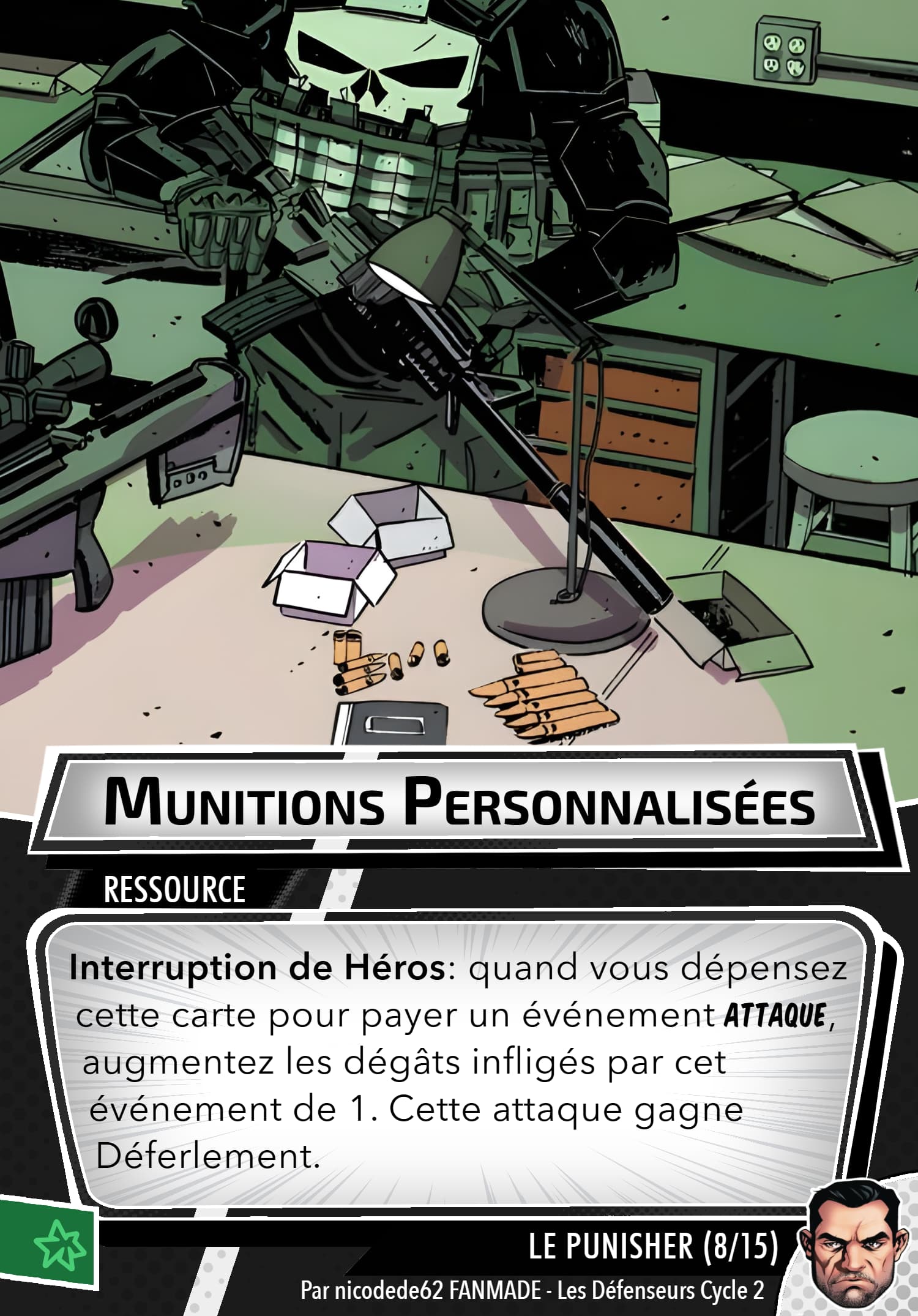 Mais rassurez vous, le punisher possède un arsenal digne d’une artillerie, sa capacité de setup permet de prendre les cartes qu’ils faut, j’en ai déjà repéré des superbes en agressif, justice et même protection, inexistant quasiment en cmd. Ça reste thématique…
