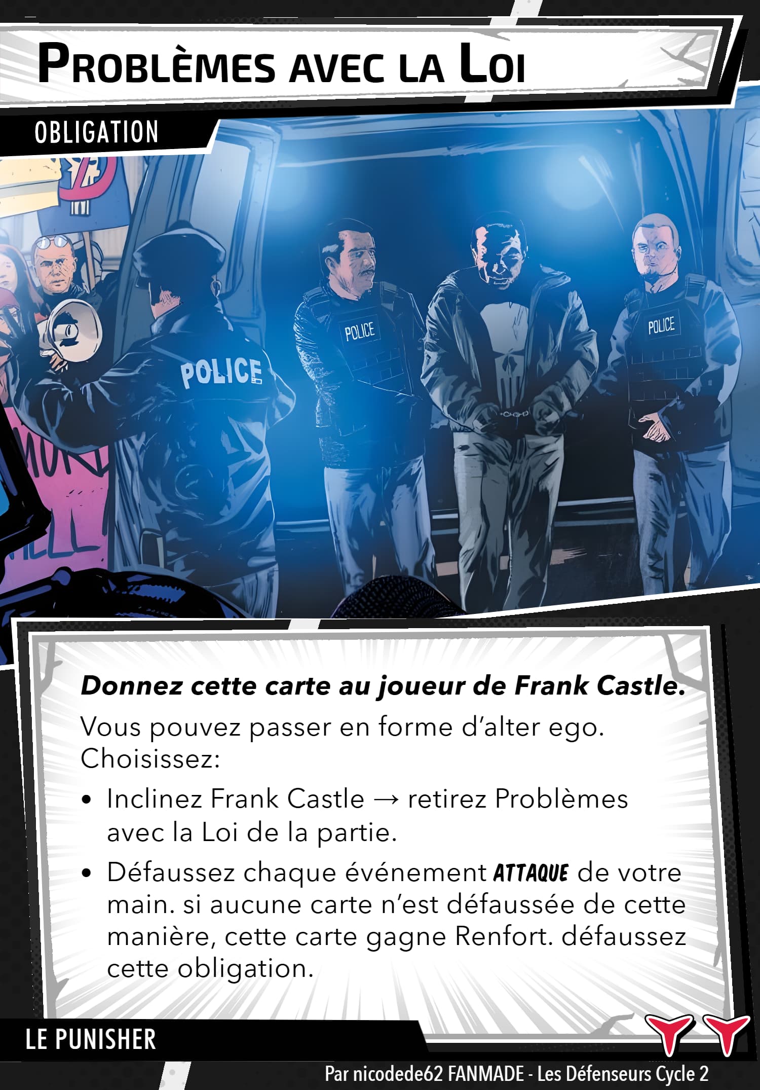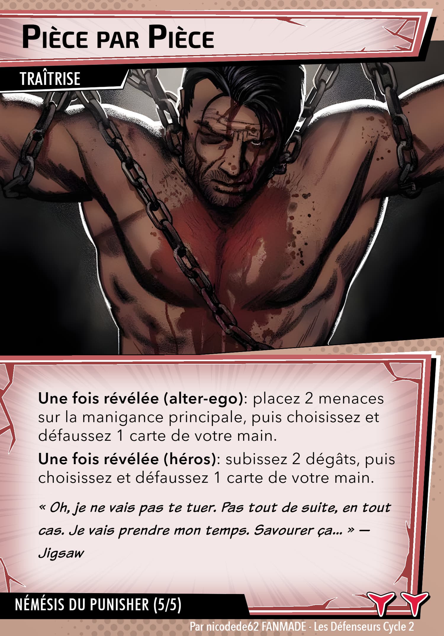 J’ai volontairement évité de mettre des photos trop violentes comme j’en ai vu dans les comics. Il n’y a que 2 cartes avec du sang, j’espère qu’elle ne gêneront pas pour ceux qui joue avec des ados )