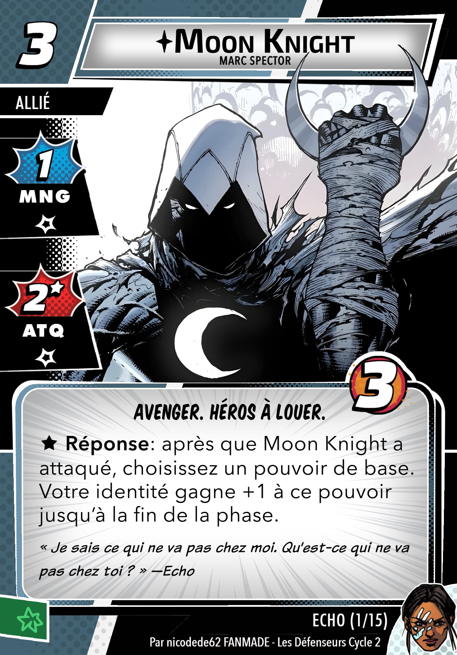 Cela conclu le premier héros de ce 2e cycle qui ressemble à thor dans sa mécanique d’absorber des sbires mais poussé par le désir de faire justice! Avec des effets permettant d’aller en chercher, de les laisser venir, de les remettre en selle… Bref, vous l’aurez compris, c’est un aimant à sbire.