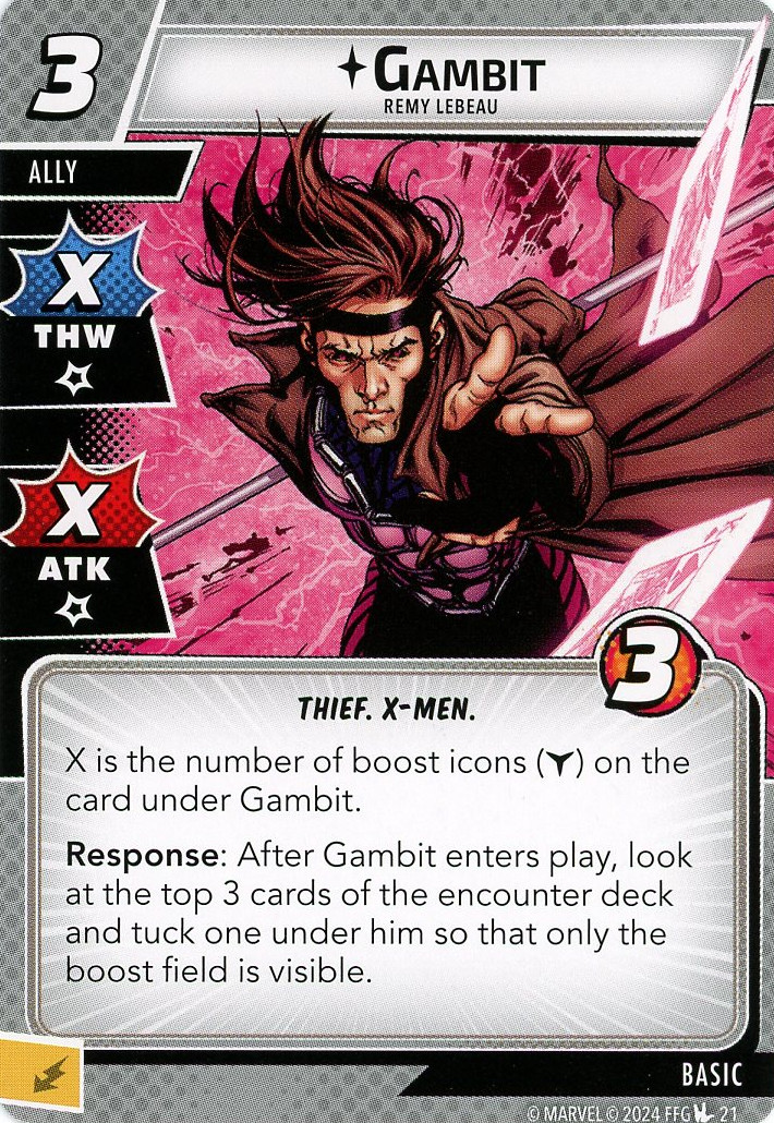 La plupart des cartes vertes du pack vont être des basiques des decks protection. Et puis l’allié Gambit whaou.