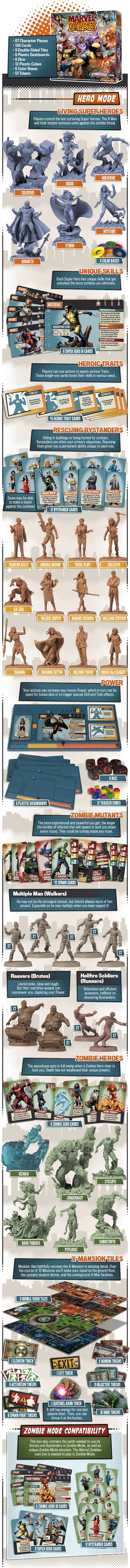 Heros de la Resistance : Tu joues les héros (principalement des héros des Avengers) contre des zombies (en standee) et des héros zombifiés en guise d’abomination. Contenu réduit avec quelques scénarios, 4 tuiles, moins de cartes traits et les standees pour les zombies.