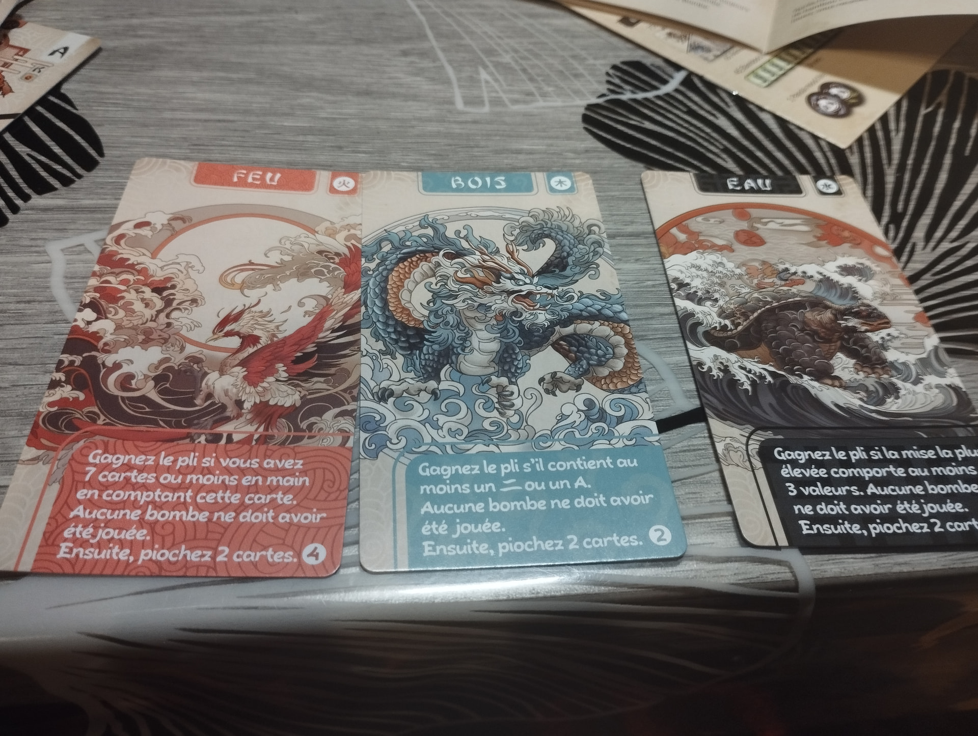 A chaque fois que revient mon tour de jouer revient également ce choix. Pareil pour certaines de mes cartes où j’essaie de perdre le pli pour obtenir un bambou et ainsi un point de victoire. Et au final j’ai trouvé le jeu beaucoup plus tactique à deux que je ne le pensais. Évidemment qu’il y a du hasard puisqu’on joue avec 24 cartes sur les 42, mais il y a matière à réfléchir. Comme pour les cartes éléments qui permettent de remporter un pli mais font aussi piocher 2 cartes. J’ai donc choisi de les défausser plutôt que de les jouer, mais je ne suis toujours pas certain de la qualité de ma décision.