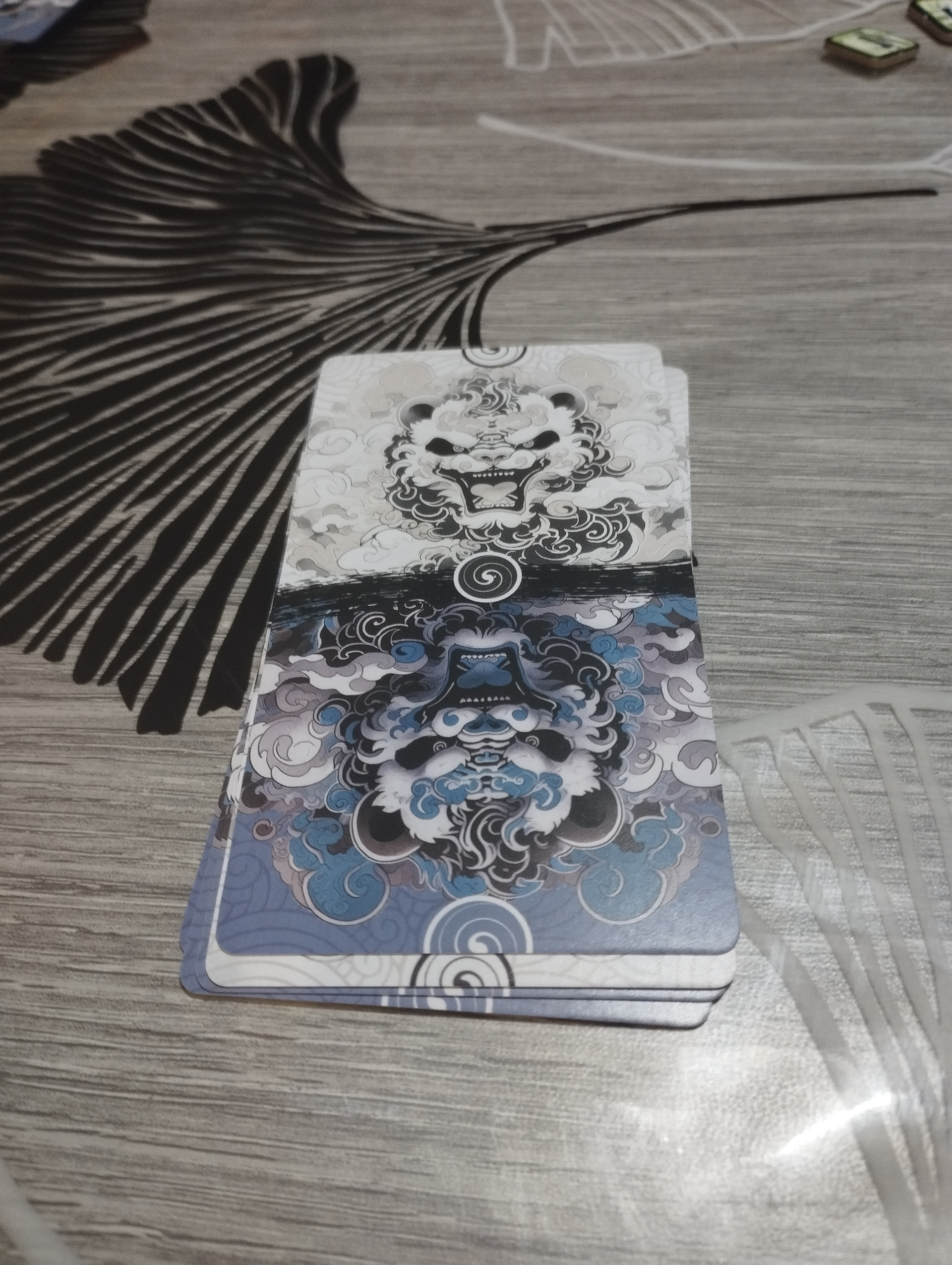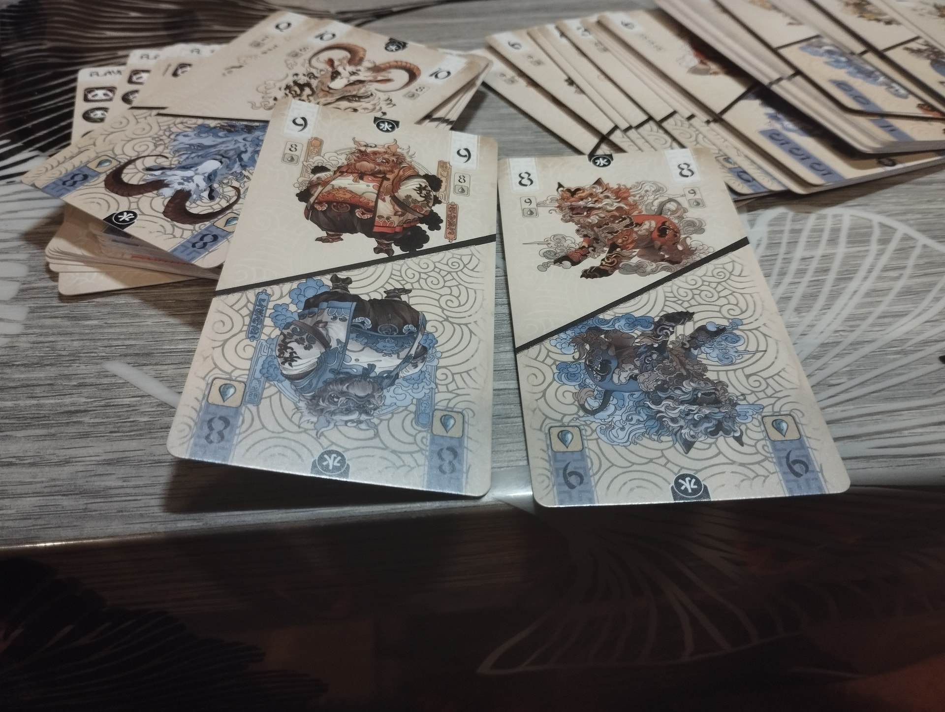 La particularité du jeu se situe au niveau des cartes qui sont divisées en une partie blanche en haut et bleue (plus puissante) en bas. Lorsque vous remportez un tour, vous défaussez vos cartes mais lorsque ce n’est pas le cas, vous récupérez vos cartes du côté bleu et votre main s’en trouve améliorée. Chaque élément apporte ses propres bonus. Par exemple le feu vous permet de défausser une carte et le bois vous apporte du bambou, qui rapporte un point de victoire quand la carte est jouée. Précision malgré tout, si vous perdez un tour en ayant joué une carte côté bleu, vous défaussez vos cartes malgré tout.