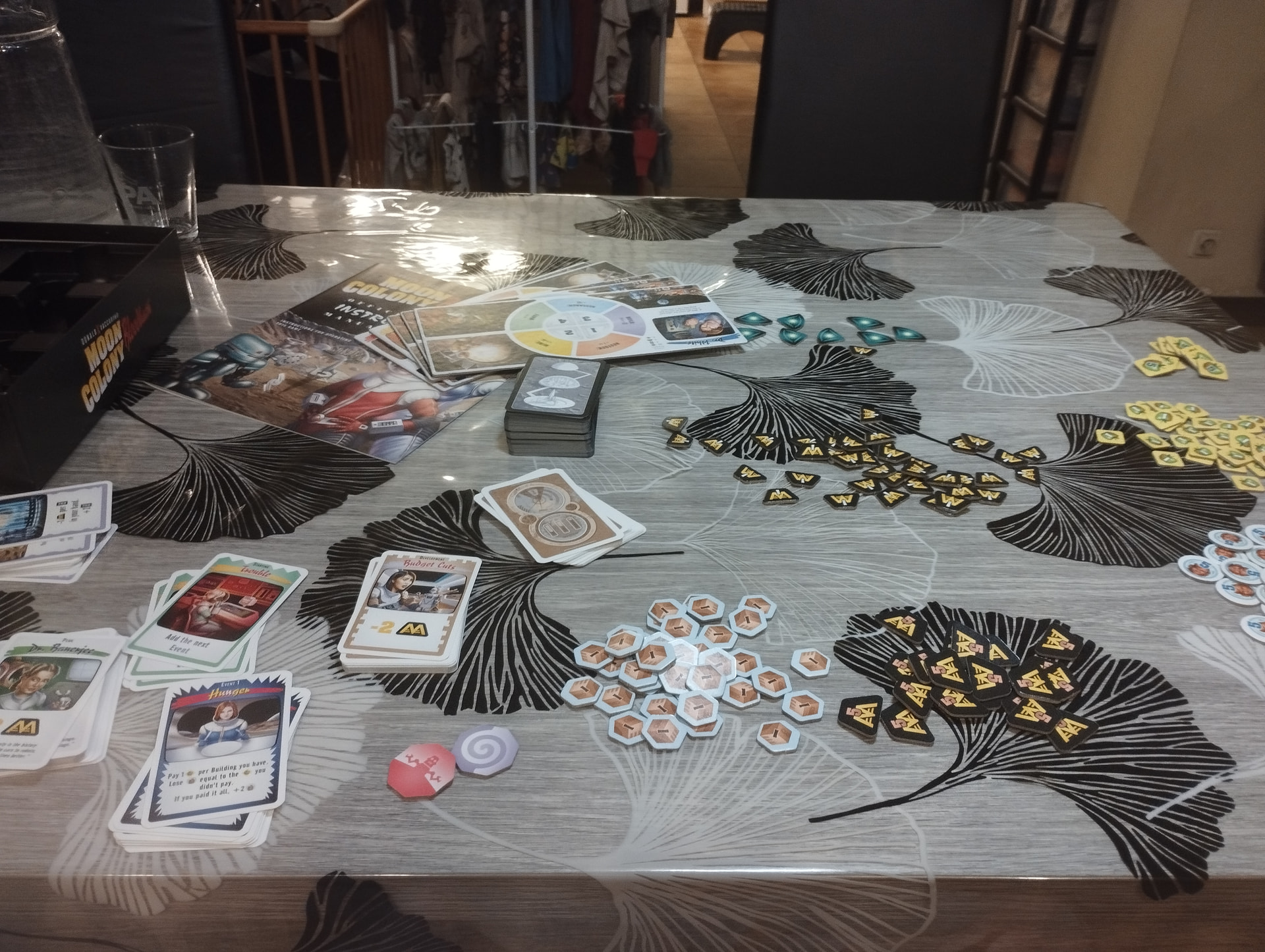 On est sur un jeu avec beaucoup de cartes, et aussi un grand nombre de tokens représentant les gens, la nourriture et l’argent. J’ai dit que j’aimais lire les règles mais je déteste dépuncher, il y avait de quoi faire. Cela dit les tokens sont assez épais et le plateau joueur également. Les cartes de la pile « process » sont souvent mélangées et nécessiteront d’être sleevées à mon avis.