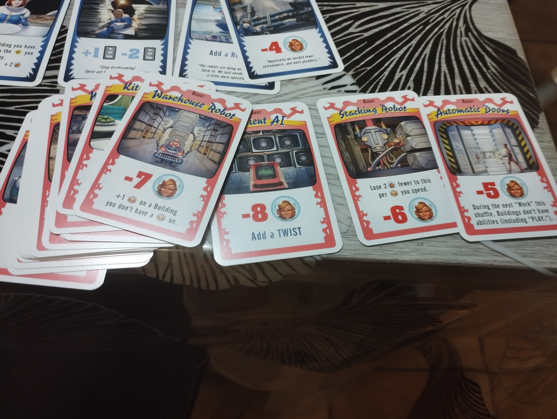 - Les cartes robots sont les pires, ces saletés veulent votre peau. Le troisième événement en ajoute un par mélange, qui s’ajoutera bien sûr à ceux qui y étaient déjà. Certains bâtiments peuvent également en ajouter.