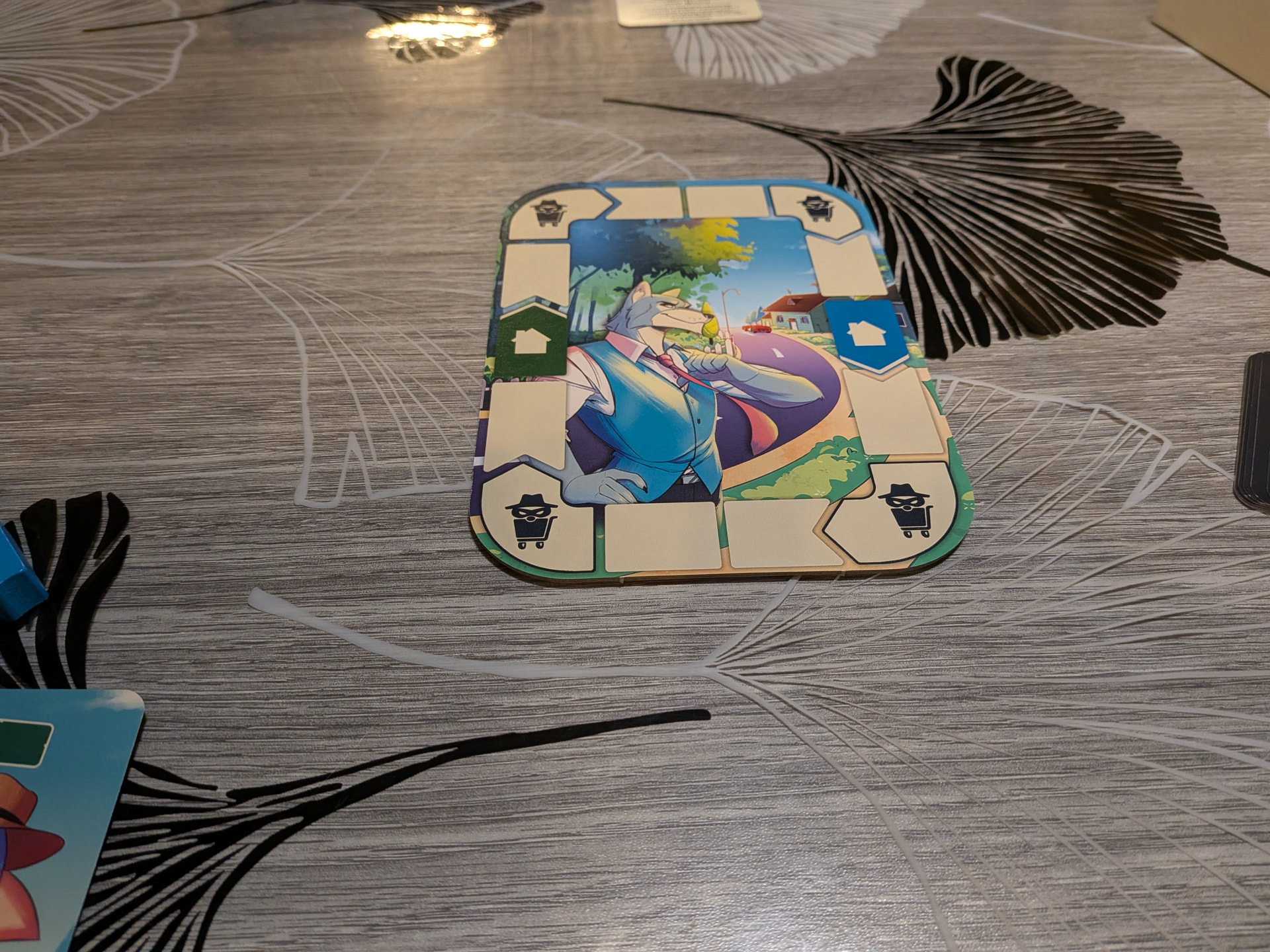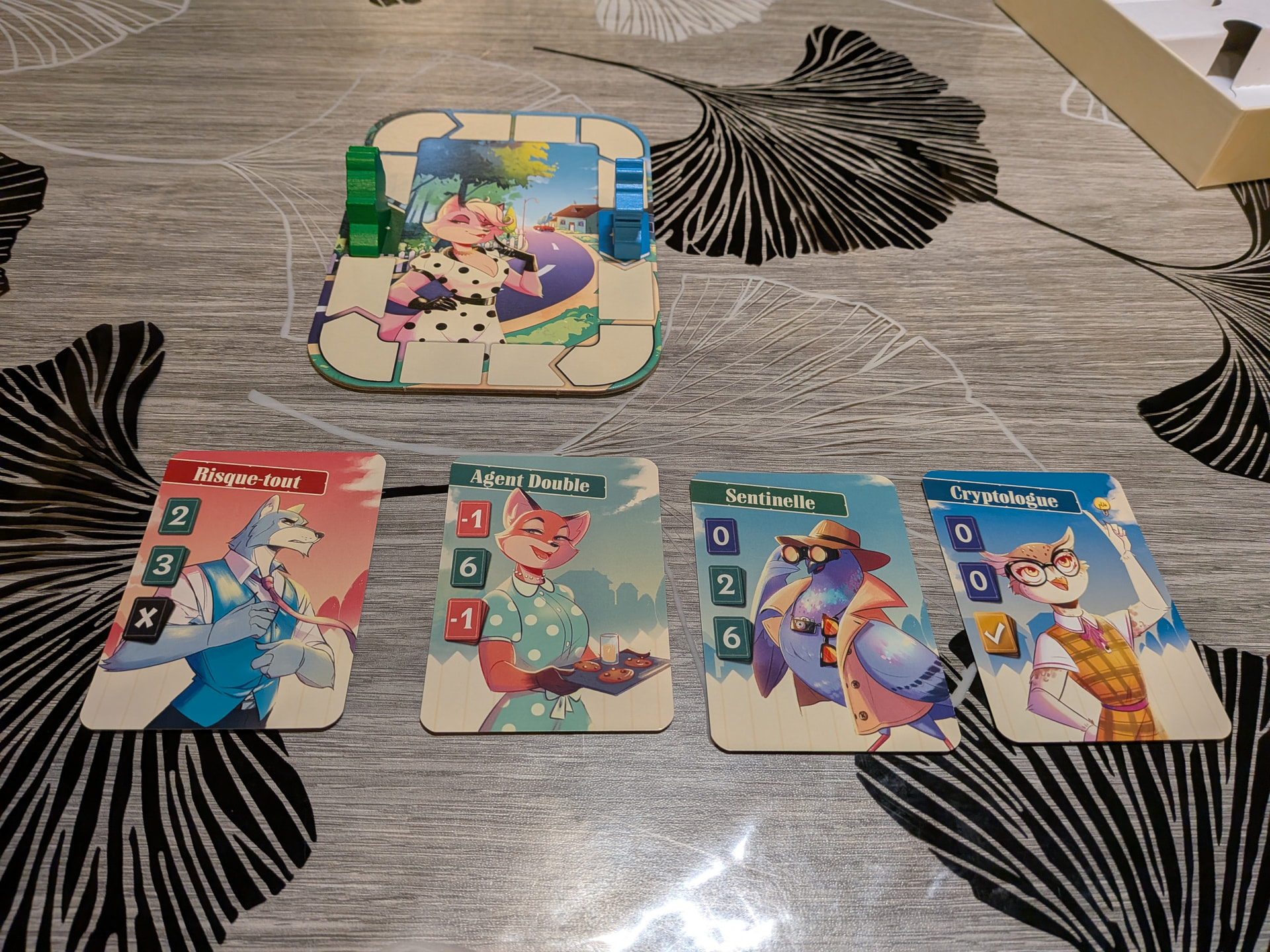 Nous avons ici un jeu de duel basé sur le bluff et le guessing. Nous incarnons deux espions, un chat et un chien tentant de rattraper l’autre en tournant autour d’un plateau ovale.