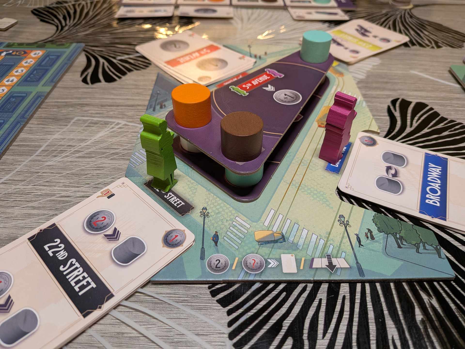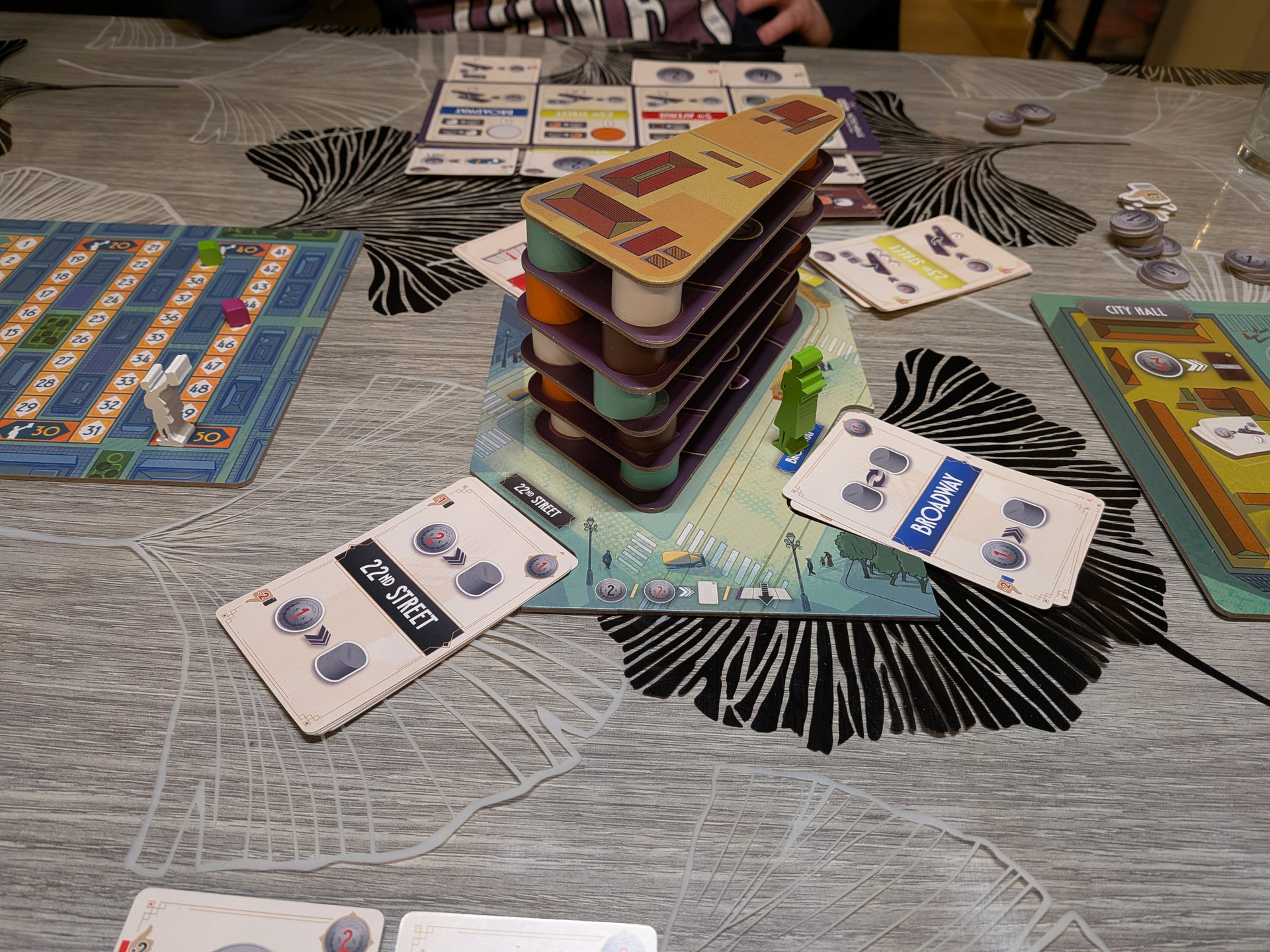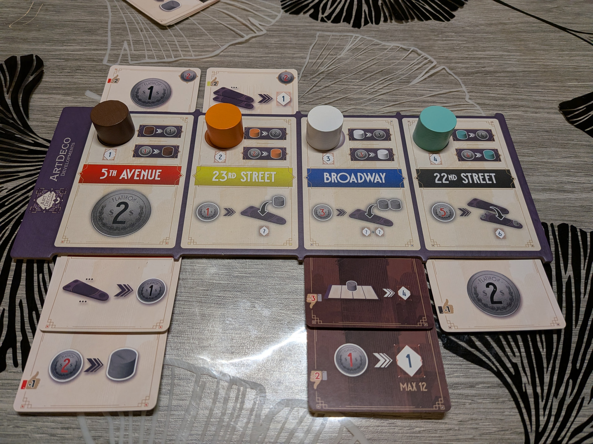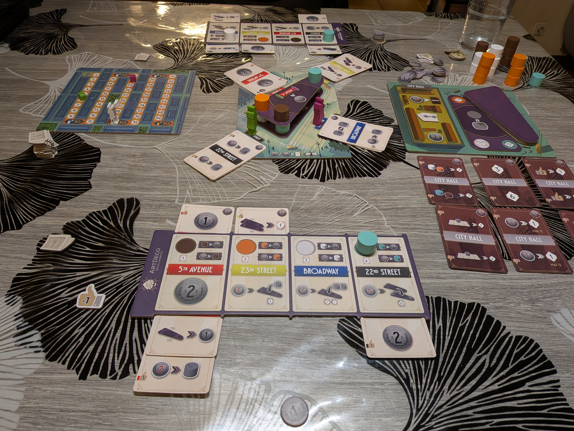 Comme souvent quand je découvre un jeu, je me dis que l’argent est le nerf de la guerre. J’essaie donc de m’acheter des cartes qui me rapporteront de l’argent (ou bien qui me permettront de payer mes piliers moins cher) et j’essaie de me concentrer sur une rue. De la sorte, c’est jackpot lorsque je la visite. On ne peut ajouter que trois cartes au maximum à une rue mais c’est bien suffisant.