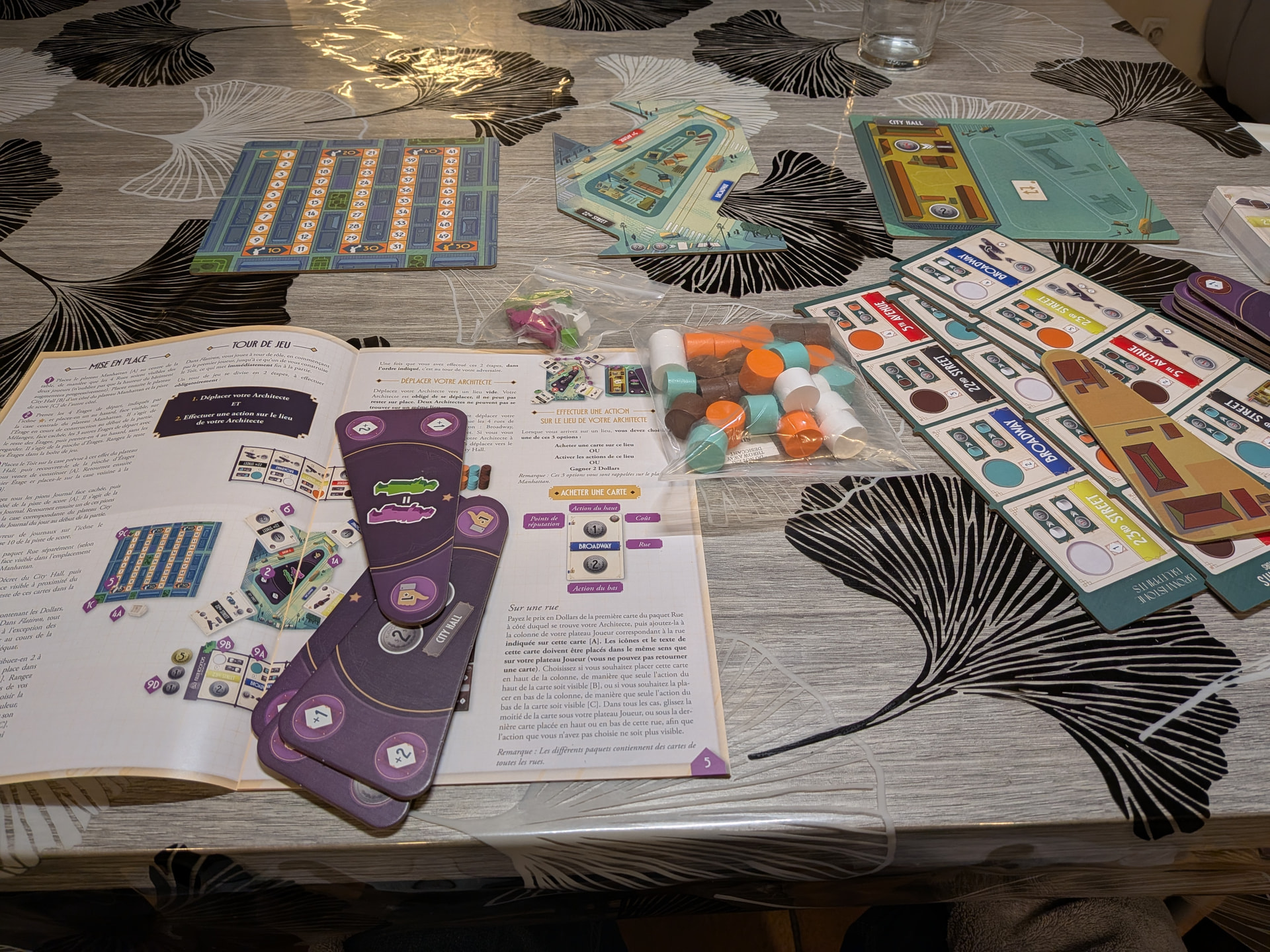 On a également une grande variété d’étages pour le building et on a les jolis petits piliers en bois. Ajoutez à cela quelques meeples, des tokens et les cartes pour les quartiers et les décrets, le jeu n’est pas avare en contenu.