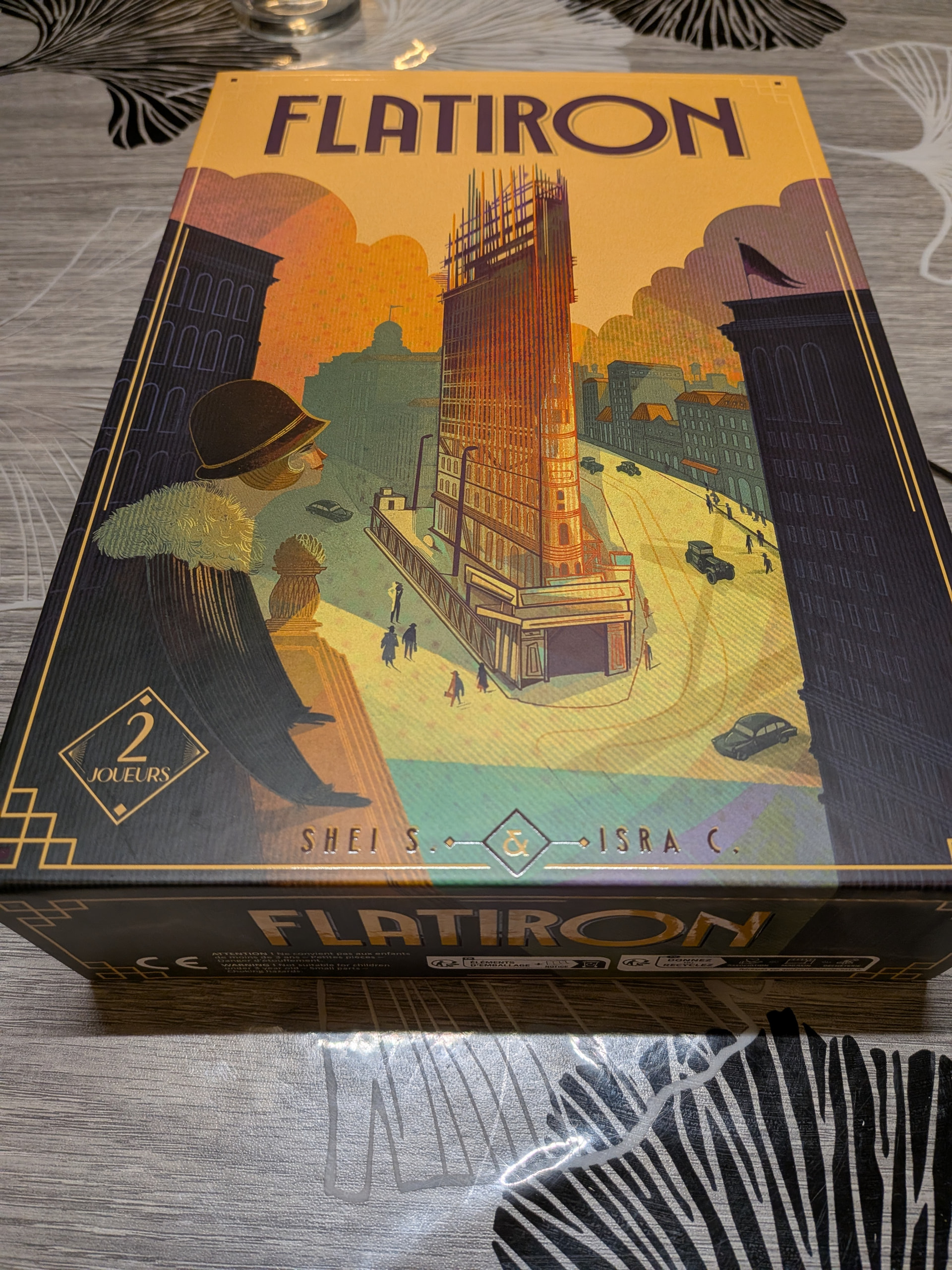 Je termine aujourd’hui ma série de jeux à deux avec mon neveu de samedi. Flatiron est un jeu d’Israël Cendrero et Sheila Santos, illustré par Weberson Santiago et édité chez Ludonova.