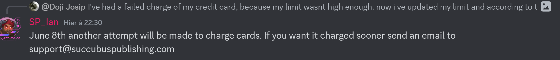 Ils m’ont dit qu’ils ont eu des pb avec plusieurs backers dont les coordonnées étaient corrects mais font le paiement ne passait pas. Ils vont m’envoyer une demande paypal