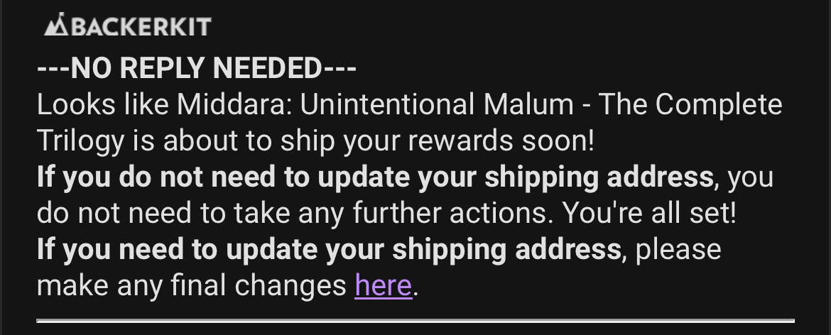 Je demeure confiant et comme pour toutes les campagnes KS pour lesquelles j’attends quelque chose actuellement - environ 26 au compteur -, j’ai tendance à laisser vraiment ces dernières dans la case « preordered » de ma collection BGG, à les oublier jusqu’à leur avis d’expédition réels (numéros de suivi).