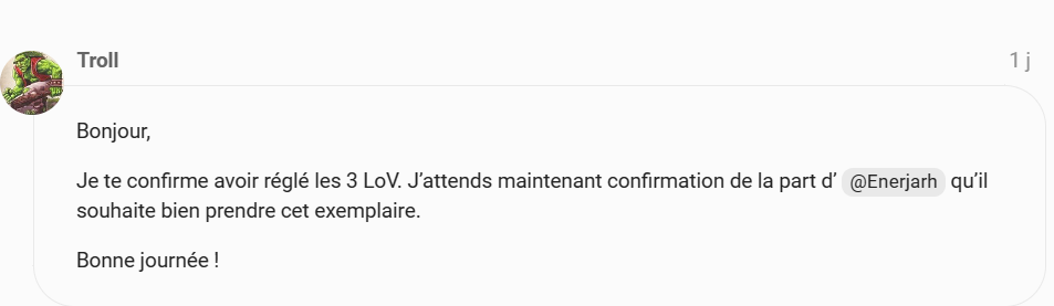 Hello, il s’est juste pas connecté depuis mardi soir, mais c’est good pour ton exemplaire de LoV. Sa réponse quand je lui ai posé la question pour le paiement des 3 exemplaires de LoV :