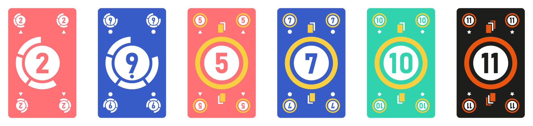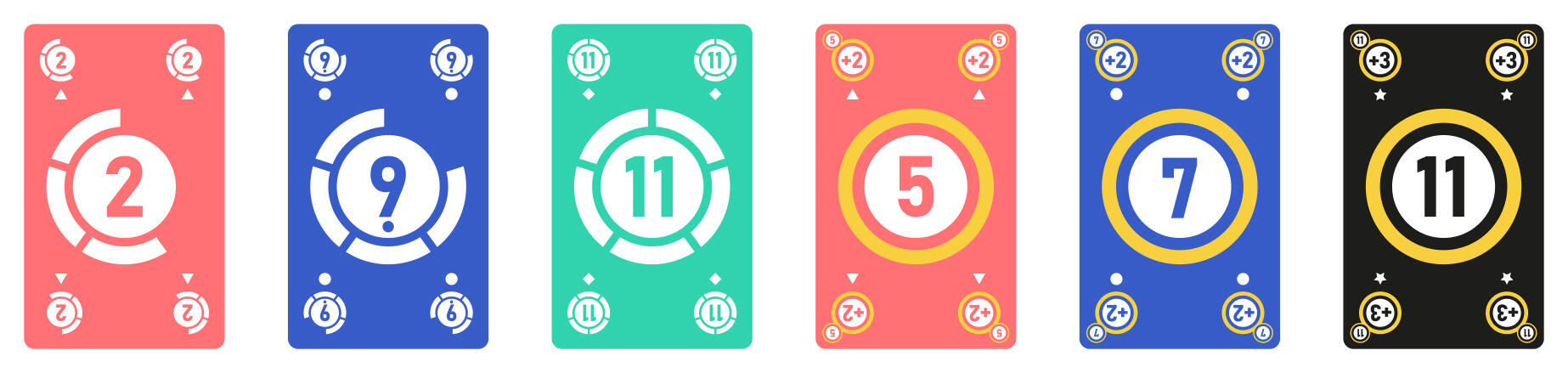 Ou alors tu mets un cercle de couleur différente en fonction de la valeur du “+”: par exemple le cercle jaune comme dans les exemple correspond au +2 et un cercle rouge au +3. Tu n’aurais plus besoin de rajouter le chiffre dans les coins (car visible); mais tu pourrais le mettre au dessus et en dessous du rond central par exemple.