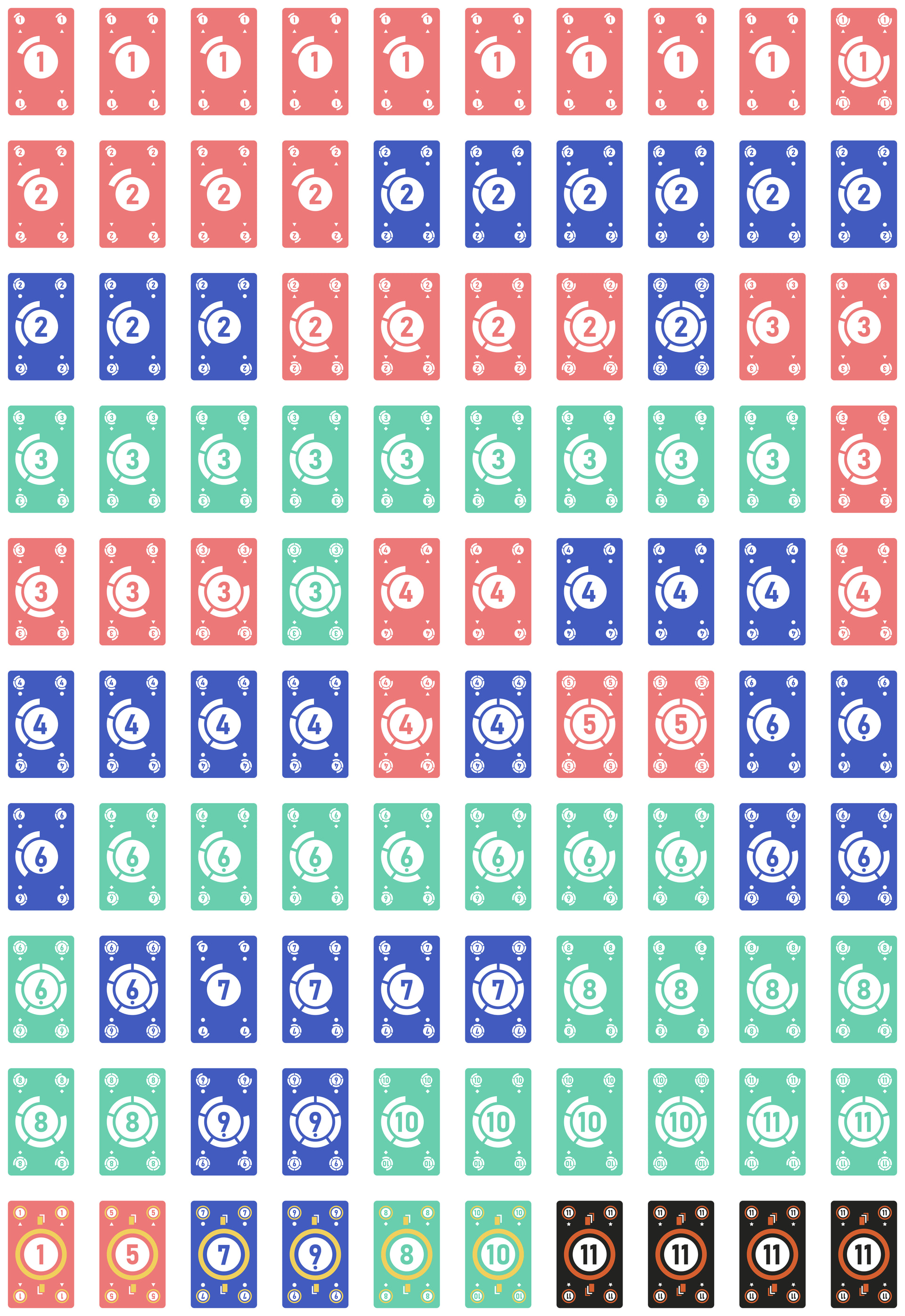 Pour donner suite aux derniers échanges, j’ai fini de décliner le principe du ‹ chiffre maître › sur l’intégralité du deck. Ça permet de voir si le système de satellites tient la route sur le volume complet (100 cartes) :