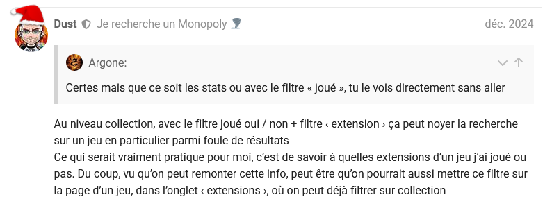 Pour ce qui est de voir spécifiquement les extensions d’un jeu qui n’ont pas été jouées, aller dans la gamme, filtrer sur collection = oui et joué = non.