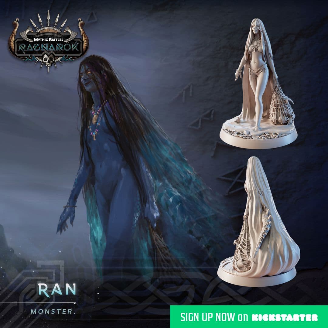 Les scaldes prétendent qu’il y a trois sortes d’êtres humains : ceux qui sont vivants, ceux qui sont morts et ceux qui sont en mer. Privés de funérailles, leurs proches et leurs clans attendront toujours ces désespérés, qui geignent en vain dans le silence des profondeurs. Ran saisit de curieuses harmonies de leurs lamentations, qui résonnent pour son plaisir dans les failles abyssales. Elle fut pourtant bonne épouse pour Ægir, en lui donnant neuf filles pétries d’eau, aussi froides et amères que celle qui les enfanta. Le temps du Ragnarök sera cependant celui où Ran révélera sa malfaisance, en conduisant dans la bataille ses armées d’innombrables noyés."