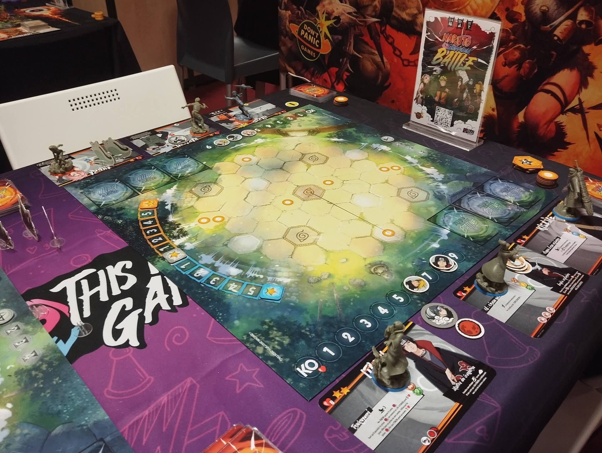 Affrontement en team de 3, les cartes qui permettent de se déplacer, dash, frapper, lancer des kunai et autre action spéciale, mais sur ces cartes, il y a aussi un élément (une couleur), avec 2 couleurs vous pouvez lancer une attaque spéciale (donc qui n’est pas une carte) qui défausse les 2 cartes de la zone de jeu (qui comporte 3 cartes pour 4 cartes piochées). C’est déjà complexe et il y a en plus un système de Chakra pour pouvoir lancer les sorts, de case objectifs pour gagner des points de victoire en mode tir à la corde et quand vous mettez KO un personnage, le score à atteindre descend du montant de puissance du perso KO.